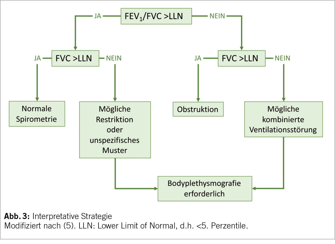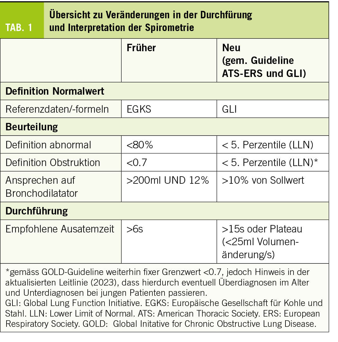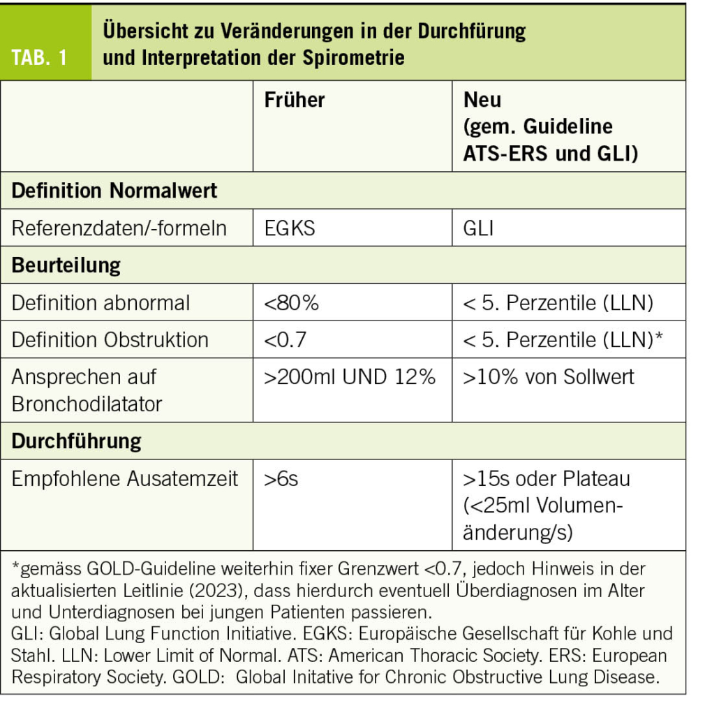 In den letzten Jahren wurden einerseits die technischen Standards in der Durchführung der Spirometrie erneuert, andererseits sind auch neuere robuste Daten zu Referenzwerten und interpretativen Strategien publiziert worden. Mit der GLI wurden neue Referenzwerte veröffentlicht, welche auf einer umfassenden Analyse von Daten aus verschiedenen Ländern und Ethnien basieren (4). Die interpretativen Strategien der Spirometrie, welche nach >15 Jahren aktualisiert wurden, haben aufgrund dieser neueren robusten Daten auch das überholte Konzept der fixen Grenzwerte und prozentualen Schweregradeinteilung verlassen. Sie empfehlen einen Ansatz nach altersspezifischen Perzentilen respektive alterskorrigierten «lower limits of normal» (LLN) (5). Im folgenden Artikel sind die für die alltägliche Praxis relevanten Punkte und Neuerungen aufgezeigt.