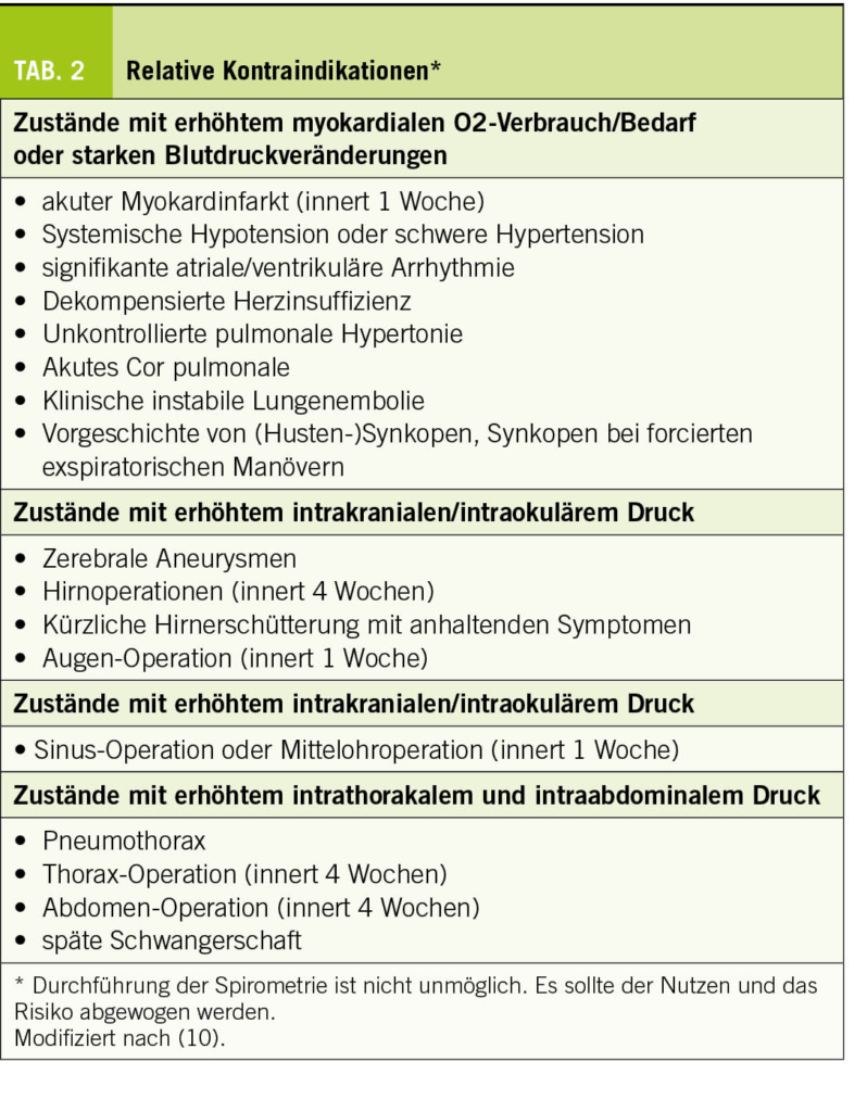 Die wichtigsten Updates in der Leitlinie zur Standardisierung der Spirometrie betreffen eine aktualisierte Liste von Kontraindikationen (Tab. 2), Definition des technischen Standards für Spirometer (ISO 26782), Empfehlungen zur Schulung und Qualitätssicherung und das empfohlene Spirometrie-Manöver, bei welchem nebst einer längeren Ausatemzeit auch auf die komplette nachfolgende Inspiration geachtet werden soll.