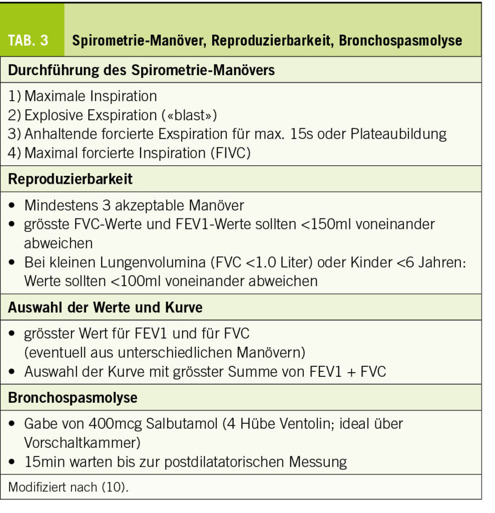 Bei der Durchführung der Spirometrie sollten die Patientencharakteristika (Alter, Geschlecht, Grösse, Ethnie) korrekt erfasst und der Patient gut instruiert werden. Das korrekte Manöver und die Reproduzierbarkeitskriterien sind in Tabelle 3 zusammengefasst. Es ist auch wichtig, die Fluss-Volumen- und Fluss-Zeit-Kurven jeweils nach dem Manöver anzuschauen und zu beurteilen, ob ein akzeptables Manöver vorliegt. Im Idealfall werden drei akzeptable Manöver durchgeführt. Nach mehr als acht Versuchen sollte nicht mehr weitergemacht werden.