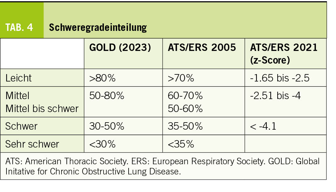 Es wird bei der Einteilung des Schweregrades der lungenfunktionellen Einschränkung vorgeschlagen, dass diese nach altersentsprechenden Perzentilen (z-scores) erfolgen soll, was jedoch derzeit im Alltag noch nicht Einzug gefunden hat. Es ist diesbezüglich auch anzumerken, dass hinsichtlich Schweregradeinteilung verschiedene Empfehlungen bestehen (Tab. 4) (11).