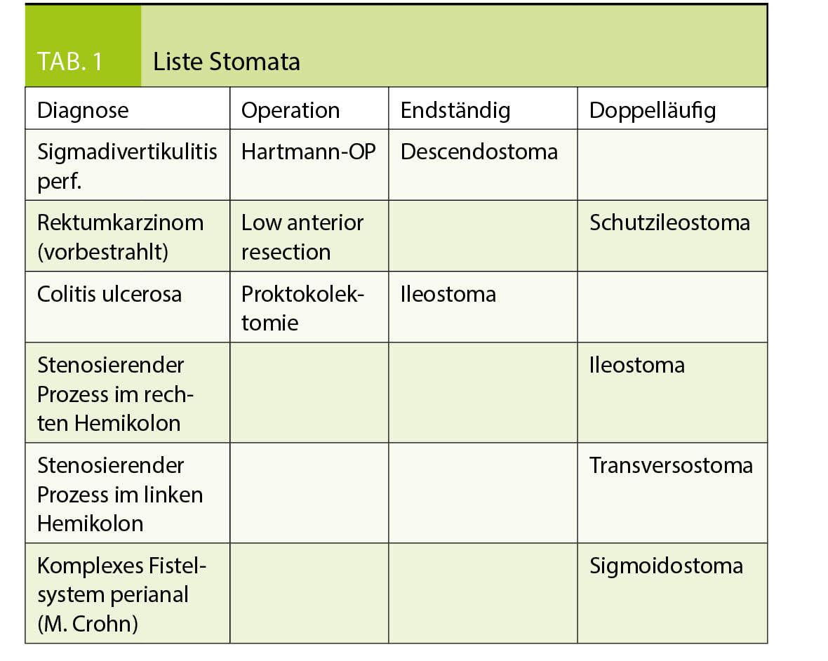 Verschiedene Krankheitszustände machen die Anlage eines Stomas notwendig (siehe Tabelle 1 für die häufigsten Indikationen) und dementsprechend ist die Unterbrechung des natürlichen Wegs des Gastrointestinaltraktes durch die Konstruktion eines Stomas in der kolorektalen Chirurgie ein häufiger Eingriff. Dank der Einführung von sphinktersparenden Operationstechniken, ist die Anzahl der definitiven Stomata deutlich zurückgegangen.