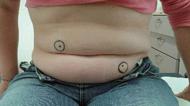 Um die Komplikationsraten so tief wie möglich zu halten, ist die korrekte Wahl der Stomaplatzierung entscheidend. Hier ist es zwingend, dass die Patientin präoperativ der Expertin für Stomapflege vorgestellt wird, um in ruhiger Atmosphäre die Lage des zukünftigen Stomas festzulegen (Abb. 1). Die Stomatherapeutin betreut die Patientinnen auch postoperativ und ist die erste Ansprechperson.