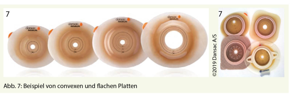 Eine Hautmazeration ist Folge einer enzymatischen oder mechanischen Schädigung der Haut, welche durch den aggressiven Stuhlgang beim Ileostoma entsteht. Die Haut wird mit einem Stomapuder (Hydrocolloid in Pulverform, Abb. 6) behandelt, damit die Feuchtigkeit auf der geschädigten Haut gebunden wird und die Grundplatte wieder besser haftet. Oft wird ein Hautschutz eingesetzt. Da der Bauch weicher geworden ist und das Stoma flacher, wird oft von einer flachen Platte auf eine convexe Platte gewechselt (Abb. 7). Die Stomaberatung überprüft die Grösse des Stomas und passt die Schablone an. Durch eine kontinuierliche ambulante Stomakontrolle können mögliche Komplikationen frühzeitig erkannt und behandelt werden. Durch die interprofessionelle Zusammenarbeit fühlt sich der Stomaträger sicher und gut aufgehoben.