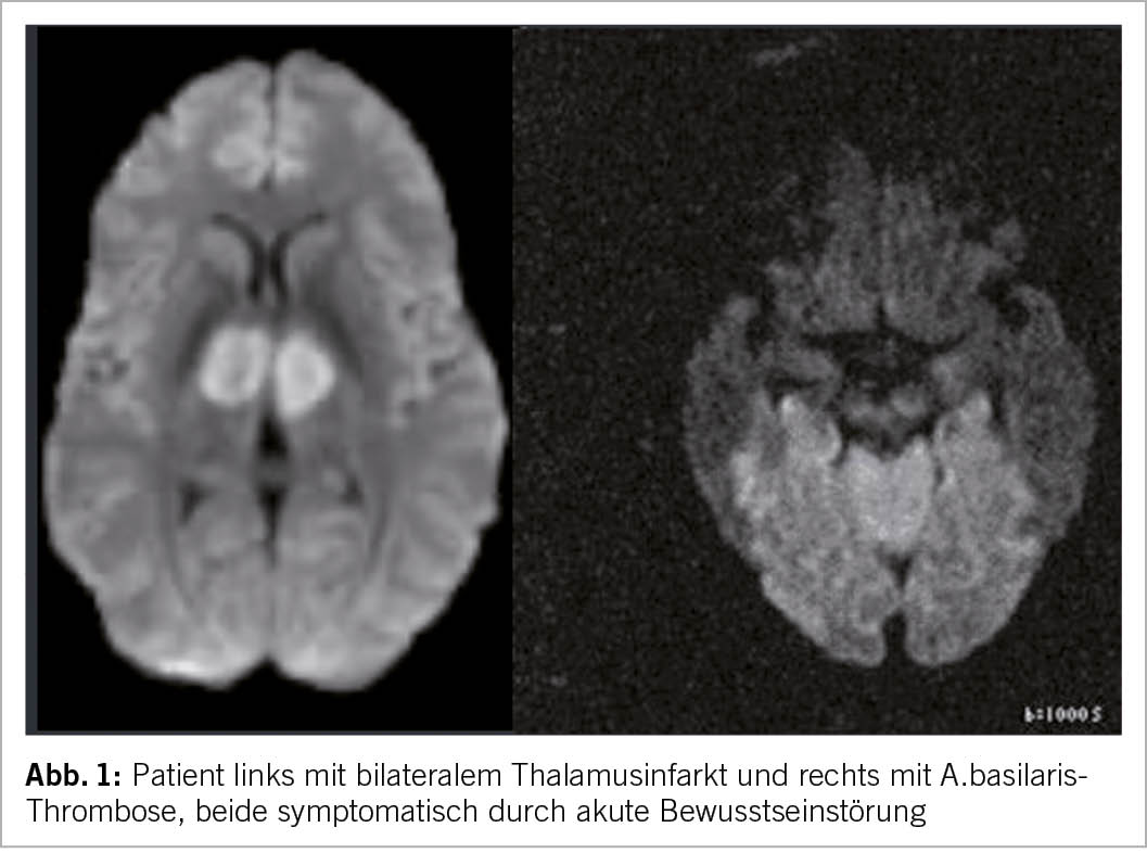 tienten können sich mit Bewusstlosigkeit und Tetraplegie vorstellen (11). Pupillenveränderungen und okulomotorische Zeichen liefern Hinweise, doch in der Regel ist zur Bestätigung der Diagnose eine CT- oder Magnetresonanzangiographie erforderlich (11). Bewusstseinsstörungen können auch bei beidseitigen Thalamusinfarkten auftreten, in der Regel in Verbindung mit vertikalen Blickparesen (12). Heimtückisch sind Situationen, bei denen der Patient intraoperativ einen Hirnschlag im hinteren Stromgebiet erleidet und postoperativ eine persistierende Bewusstseinstrübung aufweist, welche auf die Narkose zurückgeführt wird (Abb. 1).