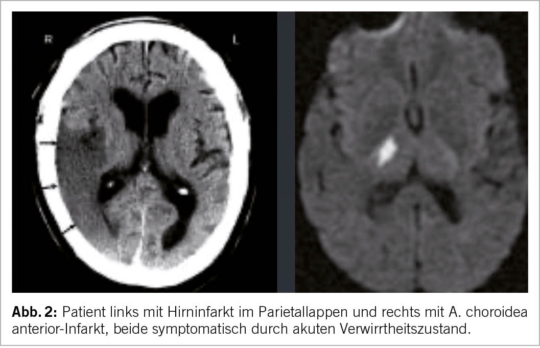 Schlaganfälle können mit Verwirrtheit, Erregung oder Unruhe einhergehen und fälschlicherweise für ein Delirium gehalten werden. Typisch sind z.B. Infarkte im Parietallappen oder auch Infarkte im Stromgebiet der A. choroidea anterior, welche eine akute Verwirrtheit auslösen können. Ein hilfreicher klinischer Hinweis ist das plötzliche Auftreten der Verwirrtheit (perakut) bei zuvor asymptomatischem Patienten (Abb. 2).