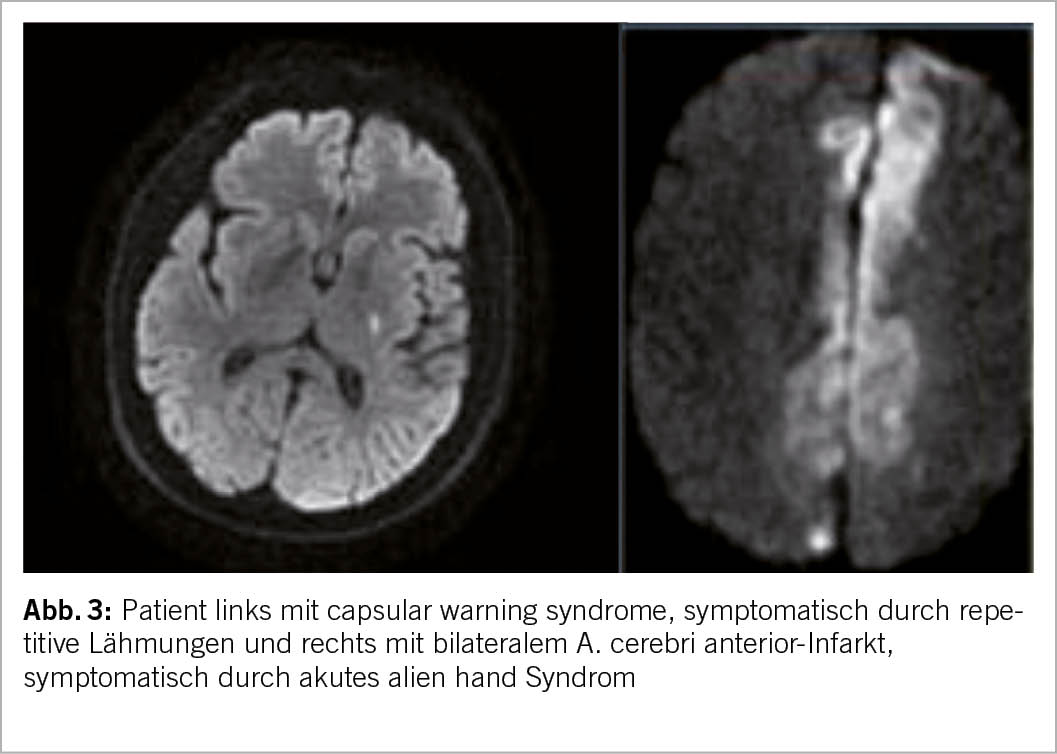 Limb shaking TIA sind rhythmische, unwillkürliche, ruckartige Bewegungen der Gliedmassen aufgrund einer schweren Stenose der A. carotis interna. Diese hämodynamischen TIA können durch eine verminderte zerebrale Durchblutung ausgelöst werden z.B. durch Haltungswechsel oder körperliche Anstrengung, und mit fokalen epileptischen Anfällen verwechselt werden. Das Alien-Hand-Syndrom ist definiert als unwillkürliche, unkontrollierbare, aber scheinbar zielgerichtete Bewegung einer oberen Extremität. Bei einem Infarkt im Bereich des Corpus callosum kann es zu verschiedenen abnormen unwillkürlichen motorischen Verhaltensweisen kommen (12) (Abb. 3).