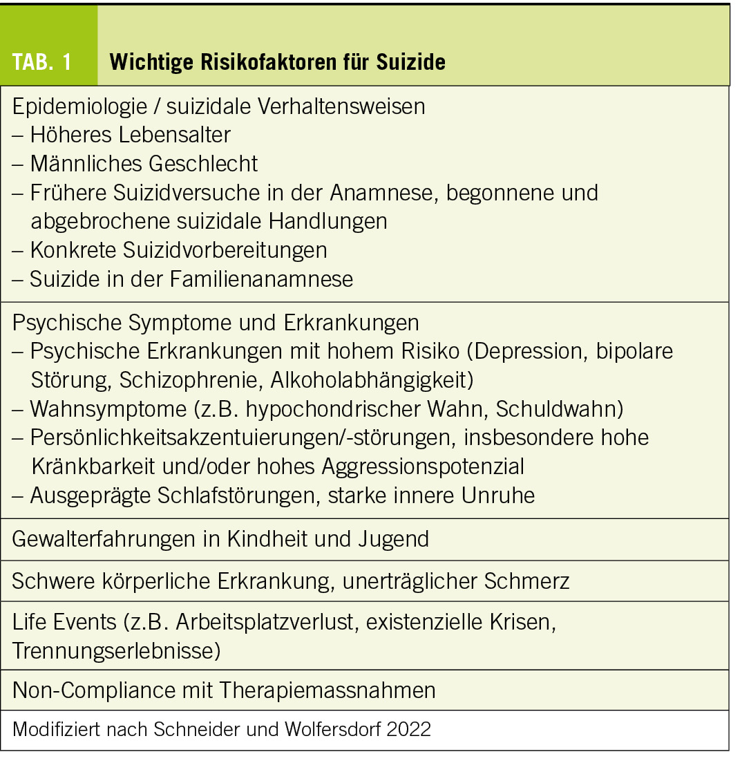 Für die Einschätzung der Suizidalität sind neben dem präsuizidalen Syndrom weitere Risikofaktoren identifiziert worden. Dies sind frühere Suizidversuche bzw. begonnene und abgebrochene Suizidhandlungen, kon­krete Suizidvorbereitungen, Suizide in der Familienanamnese und andere Modelle, Gewalterfahrungen, männliches Geschlecht, hö­­heres Lebensalter, psychische Erkrankungen, Persönlichkeitsstörungen, v.a. hohe Kränkbarkeit, aggressive, impulsive und paranoide Züge, Wahnsymptome, Angst, starke innere Unruhe, ausgeprägte Schlafstörungen, Non-Compliance mit Therapiemassnahmen, schwere körperliche Erkrankungen, unerträglicher Schmerz, sowie Life Events mit Verlusterfahrungen (Arbeitsplatz-, Partnerverlust u.a.) (2, Tab.1).