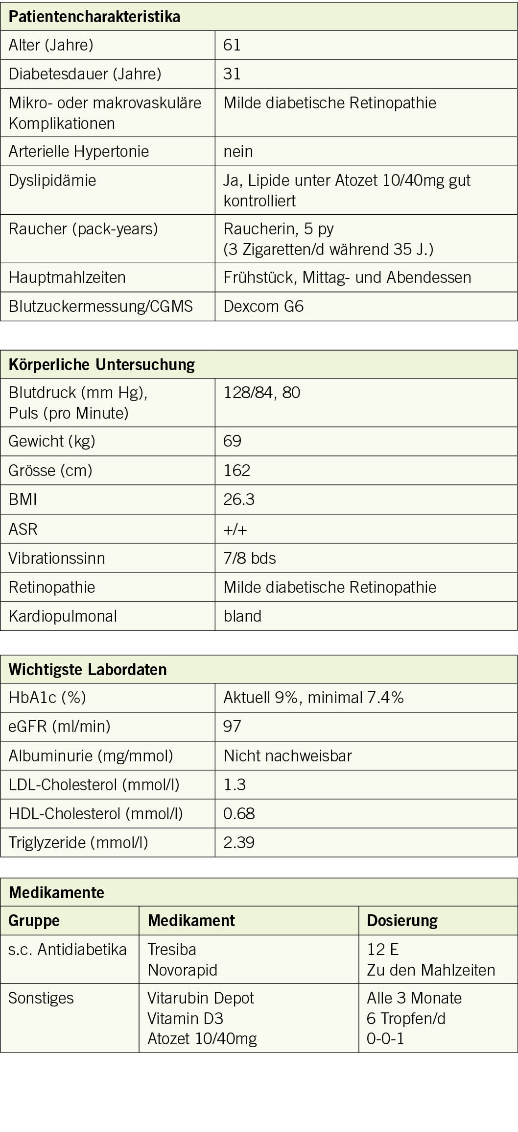 Bei einer 61-jährigen Patientin ist seit dem 30. Lebensjahr ein Typ 1 Diabetes mellitus bekannt. Zusätzlich hat sie in der persönlichen Anamnese ein St.n. M. Basedow und eine perniziöse Anämie und erfüllt somit die Kriterien eines polyglandulären Autoimmunsyndroms. Der Diabetes ist mit einem Basalinsulin (Tresiba, 12 E täglich) und Novorapid zu den Mahlzeiten behandelt (kumulativ ca. 26 E täglich). Die Blutzucker-Einstellung ist jedoch seit vielen Jahren ungenügend (HbA1c 7.5-9%). Seit 10/18 verwendet die Patientin ein kontinuierliches Blutzuckermonitoring System (Dexcom). Damit konnte sie ihre Angst vor Hypoglykämien vermindern. Aufgrund der Hypoglykämie-Angst wendet sie jedoch den Spritz-Ess-Abstand nicht zuverlässig an, d.h. das Mahlzeiteninsulin wird erst mit der Mahlzeit und nicht 15-30min vor der Mahlzeit gespritzt.