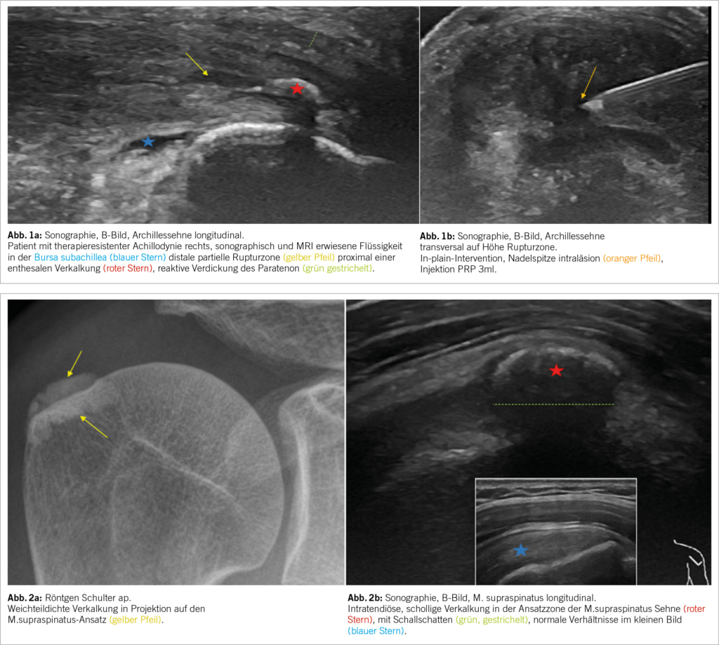 Symptome an Sehnen und Reizungen der Sehnen(begleit)strukturen (synoviale Sehnenscheiden, Bursen, Enthesen) sind häufige Erkrankungen in der muskuloskelettalen Praxis mit vielfältigen Ursachen. Die pathophysiologische Kaskade, welche zum Schmerzempfinden führt, ist nicht vollends geklärt. Nebst vaskulären Insuffizienzen scheinen extrazelluläre Matrixfaktoren inklusive Kollagenalterationen (vermehrt Kollagen Typ III zu Ungunsten Typ I) und Prostaglandine (insbesondere PGE2) eine Rolle zu spielen (1). Der Einfluss inflammatorischer Zellen ist noch nicht eindeutig geklärt, ebenso die Signifikanz tenosynovialer Stammzellen (1). Akzeptiert scheint die Pathogenese der mechanischen Überlastung («overuse») der Sehne durch Zug- und kompressive Kräfte im Sinne kumulativer Mikrotraumata (1). Der folgende Überblicksartikel konzentriert sich auf eine Auswahl klinisch häufiger Tendinopathie Manifestationen und bewertet nebst allgemeinem Überblick vordergründig die Evidenz des Einsatzes von Eigenblut (PRP = platelet-rich plasma) Injektionen und Stosswellentherapie (ESWT = Extracorporale Stosswellentherapie).