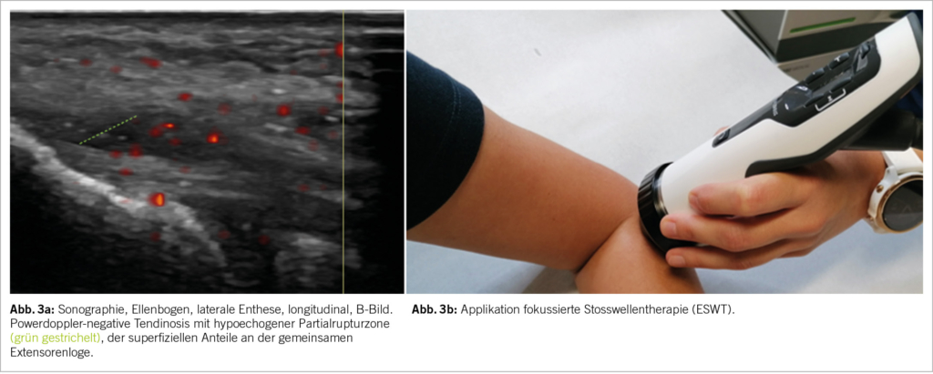 Therapeutisch kann neben oralen oder topischen NSAR auch überbrückend topisches Glyercoltrinitrat eingesetzt werden, nebst Aufgleisung physiotherapeutischen Trainings (progressiv-resistive Übungsprogramme). Kombiniert zu letzterem kann auch Manual-Therapie kurzzeitig Griffkraft und Schmerz positiv beeinflussen und somit Physiotherapie positiv unterstützen (positive Review Daten mit short-term Benefit) (7). Intraläsionale Glucocorticoide können zwar kurzfristig (<6 Wochen) effektiv Schmerzen lindern, aber mehrheitlich negative Outcomes in long-term Analysen sowie potenzielle Ruptur-Komplikationen sprechen gegen den Einsatz (7). Bezogen auf Eigenblutinjektionen (PRP) finden sich hinsichtlich Schmerz positive Meta-Analysen, allerdings auch dargelegte Ineffizienz, sodass hier keine sichere Empfehlung ausgesprochen werden kann (7). Die mittlerweile breite Literatur bezüglich Stosswellentherapie (ESWT) legt in der Mehrheit der Studien positive, d.h. bessere oder zumindest gleich gute Effekte, bezüglich Schmerz und Griffkraft dar, im Vergleich zu anderen Behandlungsmodalitäten und gegenüber Sham-Behandlung, sodass radiale oder fokussierte ESWT (Abb. 3b) befürwortet werden kann (am häufigsten genutzte Einstellungsparameter: mindestens 2000 Impulse, mindestens dreimalige Intervention, wöchentliches Intervall) (7).