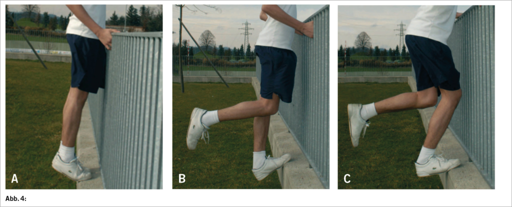 An einer Treppenstufe auf dem Vorfussballen stehend, soll sich der Patient mit einer Hand am Geländer oder an der Wand stabilisieren. Mit gestreckten Knien und aufgerichtetem Oberkörper geht er in den Zehenspitzenstand mit Hilfe des «gesunden» Beines. Von die-ser Position aus belastet er nur noch die schmerzhafte Wade und führt die exzentrische Übung durch langsames Absinken der Ferse bis unter das Niveau der Treppenstufe aus. Nun braucht er wieder das «gesunde» Bein um sich in den Zehenspitzenstand zu erheben. Repetition 15 mal. Diese Übung aktiviert vor allem den Gastrocnemius-Muskel (zweiköpfiger, oberflächlicher Wadenmuskel). (Abb. 4 a & b)