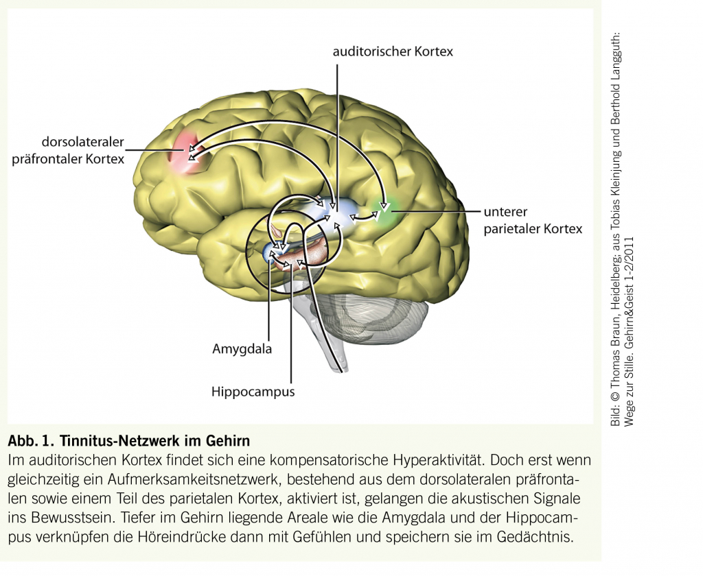 Die Pathophysiologie von subjektivem Tinnitus ist heterogen und erklärt somit die verschiedenen Ausprägungen und Unterschiede in der individuellen Betroffenheit. Ein gemeinsames Grundmodell scheint aber den verschiedenen Formen zugrunde zu liegen. Demnach führt Hörverlust zu veränderter elektrophysiologischer Aktivität im auditorischen Kortex. Der verminderte Input aus der Peripherie führt zu einer Neuorganisation des auditorischen Kortex im Sinne einer Kompensationsreaktion. Daraus resultiert eine kontinuierliche Überaktivität auch in ruhigen Situationen. Durch Vernetzung des auditorischen Kortex mit anderen Zentren des Gehirns, welche für Aufmerksamkeit und Bewusstsein (dorsolateraler präfrontaler und parietaler Kortex), Emotion (Amygdala), Stress (Amygdala) und Gedächtnis (Amygdala und Hippocampus) verantwortlich sind, kommt es zur bewussten Wahrnehmung von Tinnitus (siehe Abbildung). Je nach Konfiguration des Netzwerkes lassen sich so auch die unterschiedlichen Belastungsformen durch Tinnitus erklären. Leider lassen sich die bisher gewonnenen Erkenntnisse über die Pathophysiologie von Tinnitus (noch) nicht für eine bessere Phänotypisierung des einzelnen Betroffenen in der Praxis anwenden.