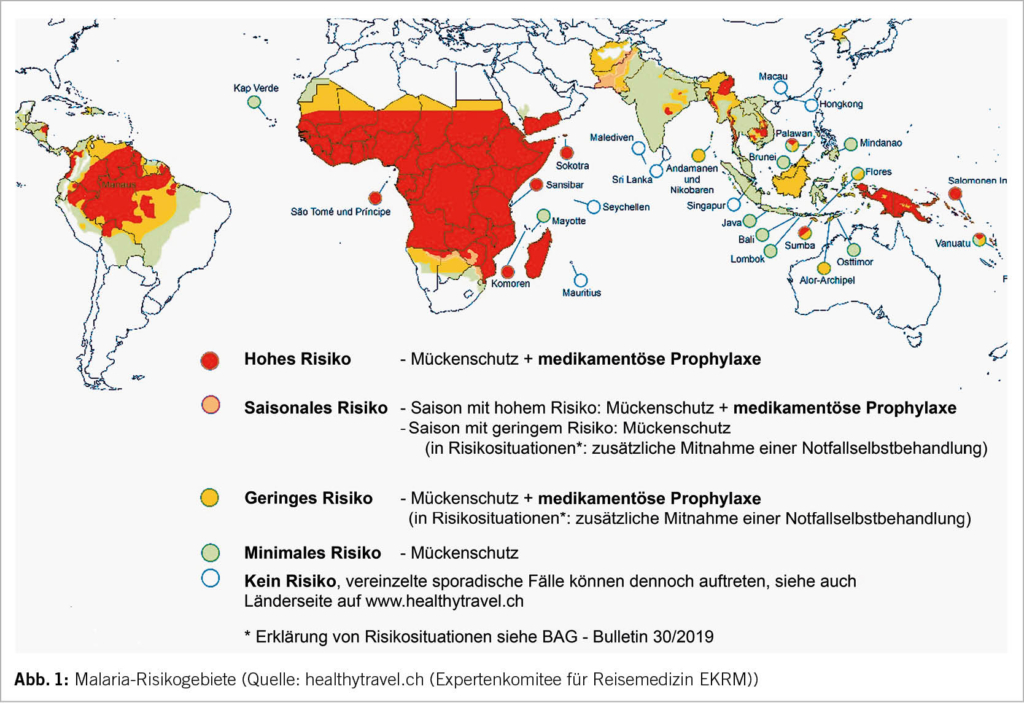 Die Indikation für die Mitnahme einer sogenannten notfallmässigen Selbstbehandlung für Reisen in Gebieten mit geringem Malariarisiko wurde in den letzten Jahren eingegrenzt (5). Da sich die medizinische Infrastruktur in den Reiseländern deutlich verbessert hat, ist eine zeitnahe Malariadiagnostik und -therapie in den allermeisten Fällen gut erreichbar. Daten weisen zudem darauf hin, dass die Notfall-Einnahme nur von einem sehr kleinen Anteil der Reisenden korrekt umgesetzt wurde (6). Die Mitnahme von Notfallmedikamenten wird daher nur noch in speziellen Risikosituationen empfohlen, zum Beispiel bei Reisen in entlegene ländliche Gebiete, wenn eine medizinische Einrichtung nicht innerhalb von 48 Stunden erreichbar ist. Unabhängig von den verfügbaren medikamentösen Strategien ist es wichtig, allen Reisenden in Malaria-Risikogebiete das Bewusstsein für das Malariarisiko und die Wichtigkeit eines optimalen Mückenschutzes zu vermitteln. Bei Auftreten von Fieber während oder auch erst Monate nach einer Reise, muss an eine Malaria gedacht werden.