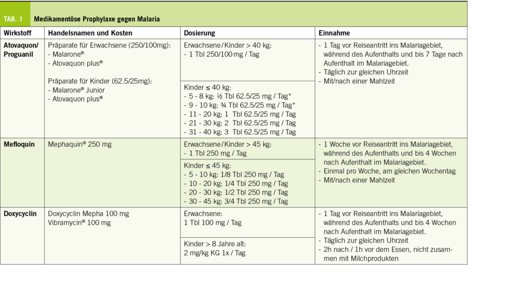 Bei Reisen in Hochrisiko-Gebiete für Malaria ist zusätzlich zum Insektenschutz eine medikamentöse Prophylaxe empfohlen. Verschiedene Optionen stehen zur Verfügung (Tab. 1). Das am häufigsten verwendete Medikament ist Atovaquon/Proguanil (Malarone®). Es eignet sich für die meisten Reisenden, wird täglich eingenommen und hat ein günstiges Nebenwirkungsprofil. Für eine optimale Verträglichkeit sollte es mit dem Essen eingenommen werden. Aufgrund fehlender Daten ist Malarone für Schwangere, Kinder unter 5 kg Körpergewicht und während der Stillzeit nicht empfohlen.