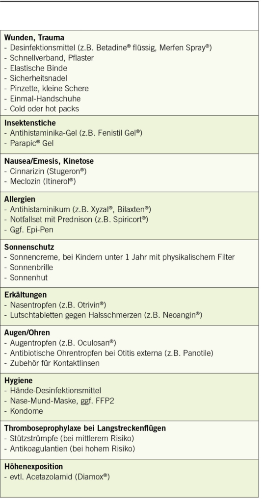 Die Reiseapotheke gehört zu jeder Reise dazu. Ihre Zusammensetzung kann jedoch variieren, abhängig von der Reise (Ziel, Dauer und Art) und der reisenden Person (Alter, Vorerkrankungen, Allergien). Nach einer Abnahme während der COVID-19-Pandemie ist die Anzahl der Reisenden 2022 international wieder auf insgesamt 900 Millionen angestiegen (1). Auch ältere Personen mit entsprechenden chronischen Vorerkrankungen reisen häufiger als früher und haben ein höheres Risiko, während der Reise zu erkranken. Hausärztinnen und Hausärzte werden somit oft nach Empfehlungen für die Reiseapotheke gefragt. Der vorliegende Artikel fasst zusammen, welche Medikamente und Produkte in eine gute Reiseapotheke gehören und erörtert die wichtigsten Indikationen und Besonderheiten. Für bestimmte Zielgruppen, wie z.B. Schwangere, Kinder, ältere Personen und Personen mit chronischen Erkrankungen, sind diese Überlegungen besonders wichtig. Es gelten einige allgemeine Empfehlungen: Die Reiseapotheke gehört ins Handgepäck, damit sie während der Reise nicht verloren gehen kann. Sie soll vor jeder Reise auf Vollständigkeit und Ablaufdaten überprüft werden. Der Inhalt der Reiseapotheke wird im Artikel nach den wichtigsten Kategorien geordnet. Mit den folgenden Tipps können die meisten Fragen der Reisenden beantwortet werden. In komplexen Fällen empfiehlt sich die individuelle Beratung in einer spezialisierten reisemedizinischen Sprechstunde.