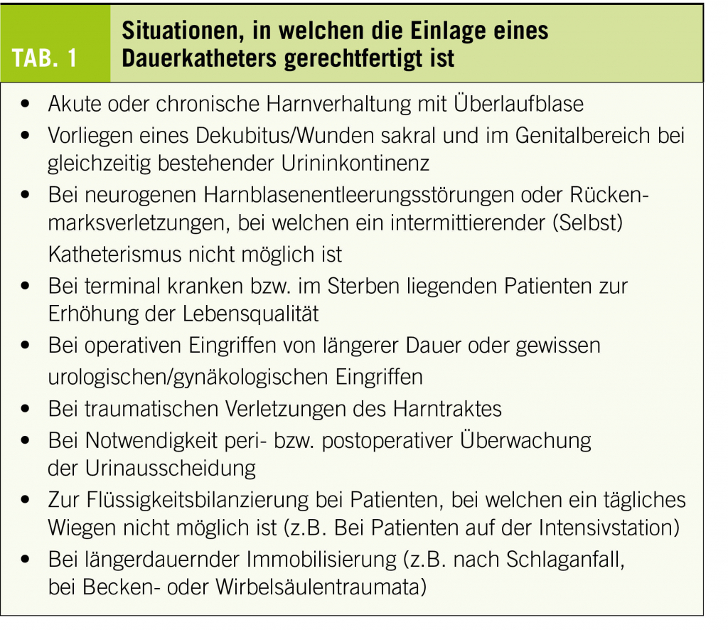 Bei beeinträchtigter Harnblasenentleerung kann die Einlage eines Kunststoff-Katheters in gewissen Situationen unumgänglich sein. Die Indikation zur Einlage eines solchen Katheters in die Harnblase muss aber stets sorgfältig hinterfragt werden, da diese immer Risiken insbesondere infektiöser Natur in sich birgt. Der Artikel fasst Indikationen und praktische Aspekte zur Einlage eines transurethralen Dauerkatheters oder eines Zystostomiekatheters zusammen.