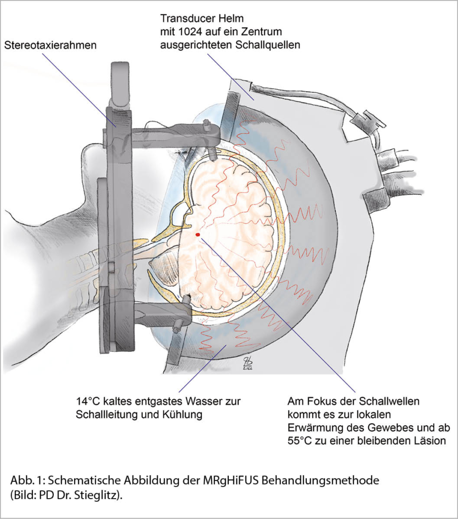 Zuletzt wurde im frühen 21. Jahrhundert mit dem MRT-überwachten Hochfrequenz-Fokussierten Ultraschall (MRgHiFUS) eine neue Technologie eingeführt, die es erlaubt, Ablationen im Zentrum des Gehirns mit hoher Präzision, Überwachung des Behandlungsfortschritts in Echtzeit und ohne Öffnung des Schädels durchzuführen. Eine Behandlung dauert ungefähr 2 Stunden und wird im Wachzustand durchgeführt. Zuvor werden die Kopfhaare des Patienten komplett abrasiert. Für die Immobilisierung des Kopfes des Patienten wird dieser in einen klassischen Stereotaxierahmen eingespannt und der Patient in Rückenlage auf einem MRT Untersuchungstisch positioniert. Ein Behandlungsgerät («Transducer») wird innerhalb des MRT Scanners über den Kopf des Patienten in Stellung gebracht, und der Raum zwischen Kopfhaut und dem Transducer wird mit Wasser aufgefüllt, welches gleichzeitig der Schalleitung und der Kühlung von Kopfhaut und Schädel dient. Die Energie aus bis zu 1024 Schallquellen wird dann auf einen 3-5 mm grossen Punkt im Zentrum des Gehirns fokussiert, welcher so erwärmt wird. Die Behandlung wird durch kontinuierliche MRT-Thermometrie in Echtzeit überwacht und gesteuert. Eine Erwärmung des Zielbereiches auf 50°C erlaubt die Abschätzung, ob Wirkung und auftretende Nebenwirkungen der Erwartung entsprechen, ohne dass bereits eine permanente Ablation resultieren würde. Für den andauernden Effekt wird das Zielgebiet dann auf 55-60°C erwärmt, wodurch Nervenzellen unverzüglich zerstört werden und der therapeutische Effekt eintritt (Abb. 1).