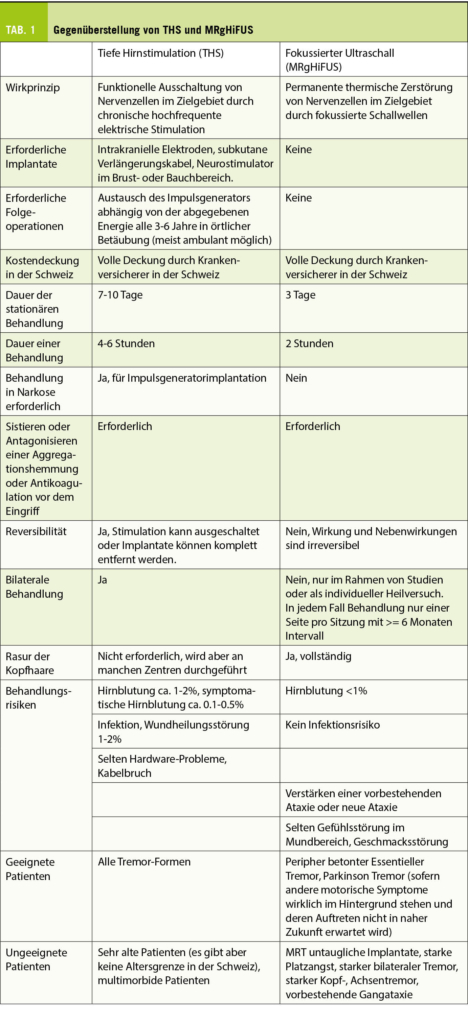 Die Behandlung mit MR-gestütztem fokussiertem Ultraschall (MRgHiFUS) ist ein relativ neues Verfahren zur chirurgischen Behandlung von Tremor-Erkrankungen. Ihre Wirksamkeit und die Behandlungsrisiken konnten in randomisiert kontrollierten Studien erfolgreich geprüft werden, und die Behandlungskosten in der Schweiz werden von den Krankenversicherungen übernommen. Die Methode stellt damit eine weitere mögliche Eskalationstherapie neben der Tiefen Hirnstimulation (THS) dar, über die Patienten informiert werden sollten. Aufgrund der jeweiligen Vor- und Nachteile beider Therapieoptionen kann für Patienten in den meisten Fällen eine klare Behandlungsempfehlung abgegeben werden.