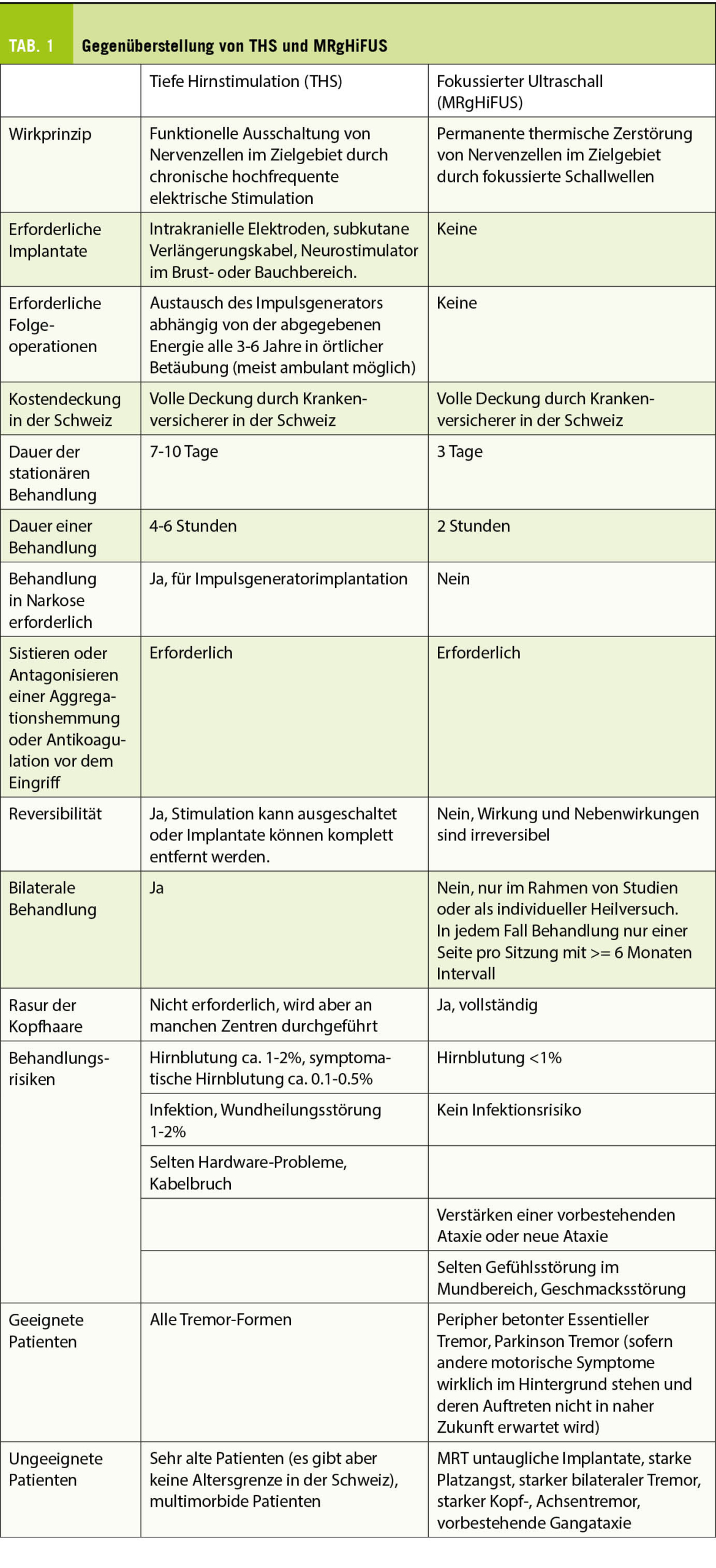 Meine eigene klinische Erfahrung ist, dass ich bei nur wenigen Patienten nach sorgfältiger Abwägung zu dem Schluss komme, dass beide alternativen Behandlungen gleich gut geeignet wären und der Patient es sich allein nach seinen Vorlieben aussuchen kann. Vorteile der Behandlung mit MRgHiFUS sind, dass nur eine kurze Hospitalisation, eine kurze Behandlung in Lokalanästhesie und keine Folgeoperationen (wie Impulsgeneratorwechsel) erforderlich sind. Ausserdem wird kein Implantat verwendet. Somit ist dieses Verfahren besonders gut für Patienten geeignet, die insbesondere unter dem Zittern einer Körperseite (meist der dominanten Seite beim Schreiben, Essen, Trinken) leiden, nicht eng an ein spezialisiertes Zentrum angebunden werden können oder bereits älter sind. Nachteile des MRgHiFUS Verfahrens sind, dass Patienten für die Behandlung im MRT keine nicht MRT-tauglichen Implantate (wie ältere Herzschrittmacher) tragen dürfen, und dass die Haare vollständig abrasiert werden müssen. Die wichtigste mögliche Nebenwirkung einer Ablation im so genannten Nucleus ventrointermedius thalami (Vim) ist eine neu auftretende oder verstärkte Gangunsicherheit. Das Verfahren eignet sich also nicht für Patienten mit einer vorbestehenden Ataxie oder einer ausgeprägten Polyneuropathie. Ausserdem wird aus diesem Grund die Behandlung immer nur auf einer Körperseite durchgeführt, da dem Patienten auf diese Weise Kompensationsmöglichkeiten innerhalb des Cerebello-thalamo-frontalen Netzwerks erhalten bleiben und auftretende Nebenwirkungen in der Regel nur vorübergehend sind. Für die THS ist in der Regel keine Kopfrasur notwendig und aufgrund der Möglichkeit, den Effekt später durch Veränderung von Stimulationsort und -amplitude anzupassen, ist auch eine direkte beidseitige Therapie in nur einer Operation kein Problem. Patienten mit starkem beidseitigem Tremor oder Tremor in der Körperachse (zum Beispiel Kopftremor) wären daher eher Kandidaten für eine THS. In der Tabelle 1 werden die Eigenschaften beider Verfahren einander gegenübergestellt.