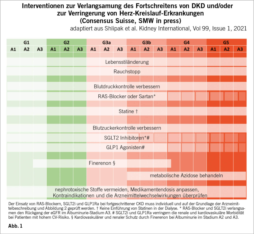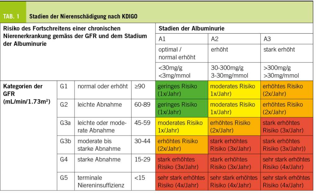 Die Prävalenz der diabetischen Nephropathie nimmt aufgrund der Alterung der Bevölkerung und der steigenden Prävalenz von Typ-2-Diabetes zu. Der Hausarzt und der Diabetologe stehen beim Screening auf diabetische Nephropathie weiterhin an vorderster Front. Eine jährliche Beurteilung mit einer Schätzung der glomerulären Filtrationsrate (eGFR nach CKD-EPI basierend auf Kreatinin) und einem Albumin/Kreatinin-Verhältnis im Urin auf einem Spot wird bei allen erwachsenen Diabetikern empfohlen. Ein Stix oder Urinsediment wird zur Vervollständigung dieser Untersuchung durchgeführt und bei pathologischem Sediment wird nach anderen Ursachen für eine Nierenschädigung gesucht. Die Häufigkeit der Kontrollen wird bei Personen, die bereits eine Nephropathie haben, erhöht (Tab.1). Von einer chronischen Nierenerkrankung spricht man bei einer eGFR < 60ml/min/Jahr und/oder bei einer Albuminurie im Stadium A2-A3. Je nach Alter kann diese Einteilung jedoch verfeinert werden (wenn Alter <40 Jahre <75ml/min/1.73 m2, wenn Alter >65 Jahre <45ml/min/1.73 m2). Letztendlich weist jeder Patient mit einer Albuminurie im Stadium A3 eine beschleunigte Abnahme der Nierenfunktion auf und benötigt eine intensive multifaktorielle Betreuung (Kontrolle des Blutzuckers, des Blutdrucks, der Lipide, des Gewichts, des Tabakkonsums, der Therapietreue …).