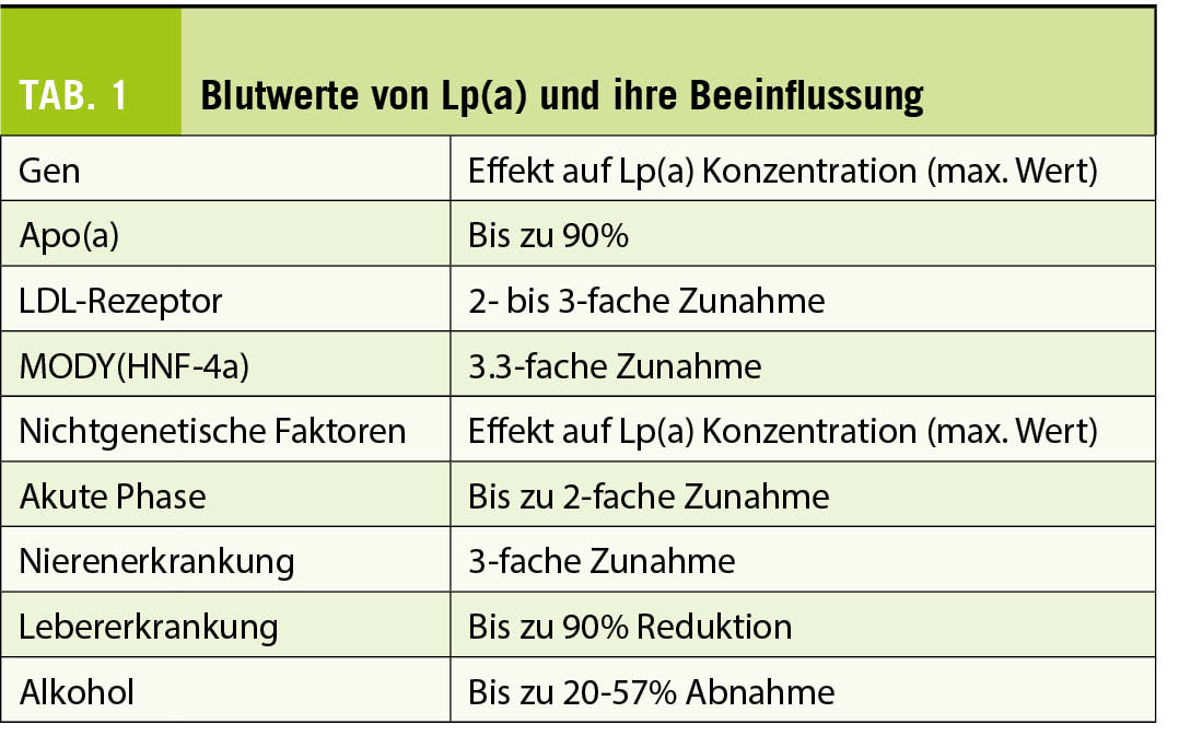 LDL-C und Lp(a) sind proatherogen, wie zahlreiche Studien ergaben. Die Kausalität für kardiovaskuläres Risiko wurde indessen nur für LDL-C mit den Statinstudien belegt, während dies für Lp(a) noch nicht eindeutig belegt ist. Die Blutwerte von Lp(a) stehen vor allem unter genetischer Kontrolle. Die Tabelle 1 gibt einen Überblick über weitere Beeinflussungsmöglichkeiten.