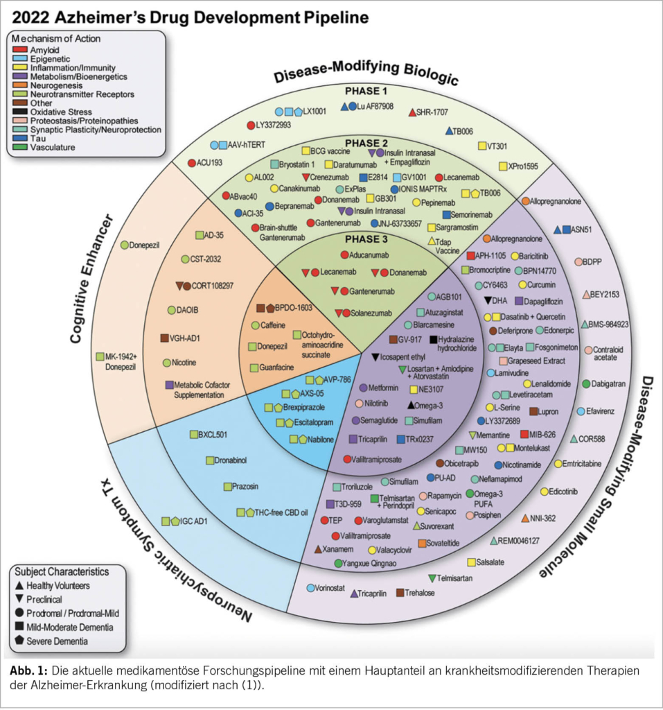 Von den aktuell 143 untersuchten Molekülen in der Alzheimer-Forschungspipeline gehört die klar überwiegende Mehrheit zu der Klasse der Krankheits-modifizierenden, d.h. kurativen Therapien (Abb. 1) (1). Experimentelle Therapien mit Zielansatz auf Tau-Proteine, Inflammation, synaptische Plastizität und Gefässveränderungen stehen hier gegenwärtig in Phase 2. Als zukünftiges Szenario werden – ähnlich wie in der Kardiologie – immer mehr kombinierte Therapieansätze denkbar. Der Trend für klinische Alzheimer-Studien ist immer mehr auch eine Interventionsverschiebung in die präklinische Krankheitsphase, die – bei fehlenden klinischen Symptomen – von der rechtzeitigen Identifizierung von krankheitsspezifischen Biomarkern abhängig ist. So wurde z.B. mit dem oben erwähnten Donanemab im August 2021 eine Präventionsstudie bei 50- bis 55-jährigen «Risiko»-Probanden mit (lediglich) erhöhtem Plasma Tau-Protein als Einschlusskriterium begonnen. Bei einer angenommenen MCI-Prävalenz von 6.7% für 60 bis 64-Jährige, 25.2% für 80 bis 84-Jährige – und einer wahrscheinlich noch höheren Rate im präklinischen Stadium – müssen bei der grossen Anzahl von potentiellen «Patienten» auch die entsprechenden Kosten erwogen werden. Neben den eigentlichen Kosten für die Moleküle braucht es aber auch eine erhebliche Anzahl spezialisierter Infrastrukturen, um die Therapien zu verabreichen. Anders als das subkutan verabreichte Gantenerumab, werden aktuell in Entwicklung stehende monoklonale Antikörper Therapien mittels monatlicher intravenöser Therapie verabreicht. Alle in dieser Klasse entwickelten Therapien gehen auch mit neurologischen Komplikationen einher (zerebrales Ödem/Blutung), die aufwändiges Monitoring (MRI) benötigen. Kein Wunder hat das amerikanische «Center for Medicare & Medicade Services (CMS)» die Versicherungsprämien für 2022 bereits um 20% erhöht.