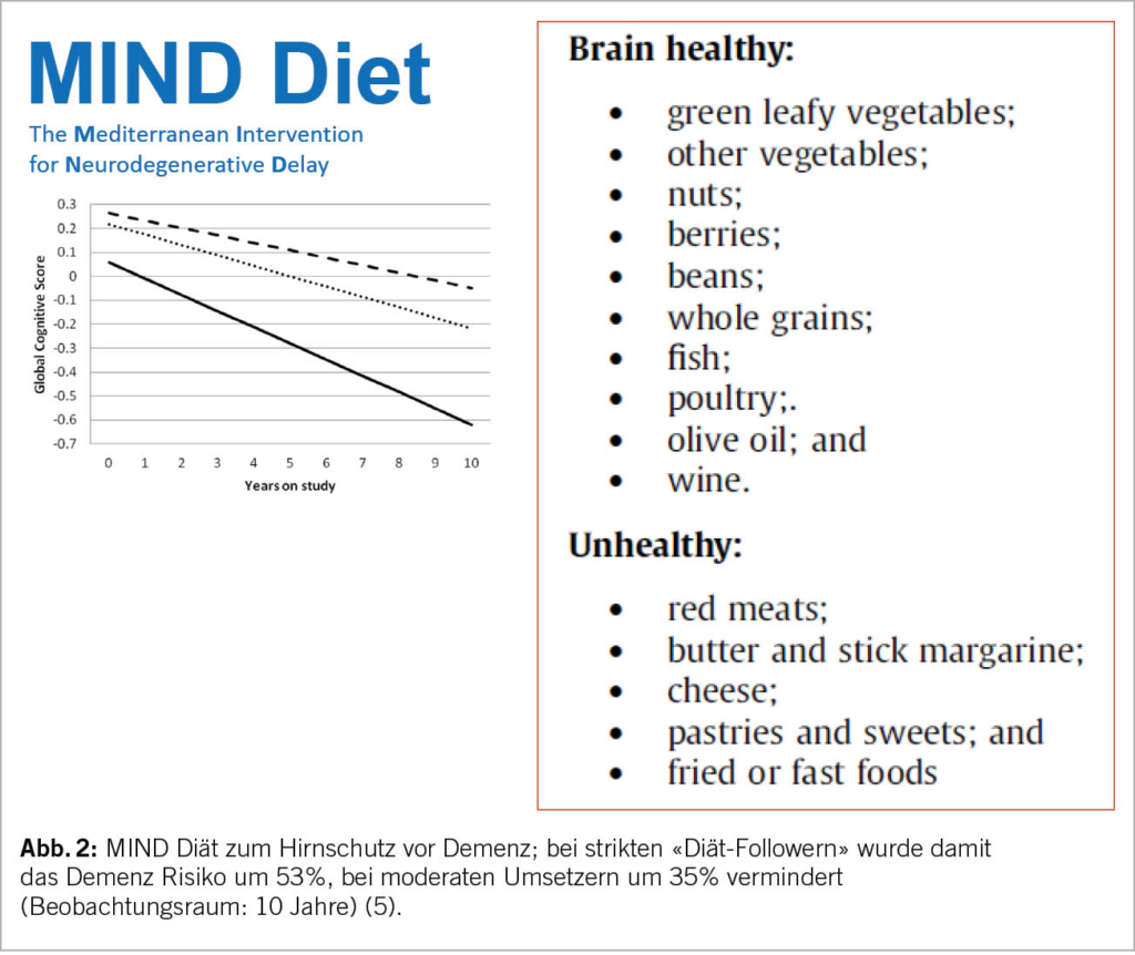 Handelt es sich gemäss DSM-5 um «milde» kognitive Störungen, befinden sich diese innerhalb von zwei Standardvariationen eines kognitiven Normalbefundes. Therapeutisch stehen hier neben medikamentösen (Ginkgo Biloba 240mg/d und Vitamin D (24’000 Einheiten pro Monat) v.a. nicht medikamentöse Massnahmen im Vordergrund: regelmässige körperliche und soziale (kognitive) Aktivität, gesunde altersgerechte Ernährung (regelmässig und genügend Protein (1.2g/kg Körpergewicht pro Tag; MIND-Diät (Abb. 2 (5)) und eine gute hausärztliche Kontrolle von vaskulären Risikofaktoren (art. Hypertonie, Diabetes, Hypercholesterinämie). In der finnischen FINGER Studie (6) konnten allein mit diesen Lebensstilmassnahmen nach 2 Jahren signifikante kognitive Verbesserungen erzielt werden!