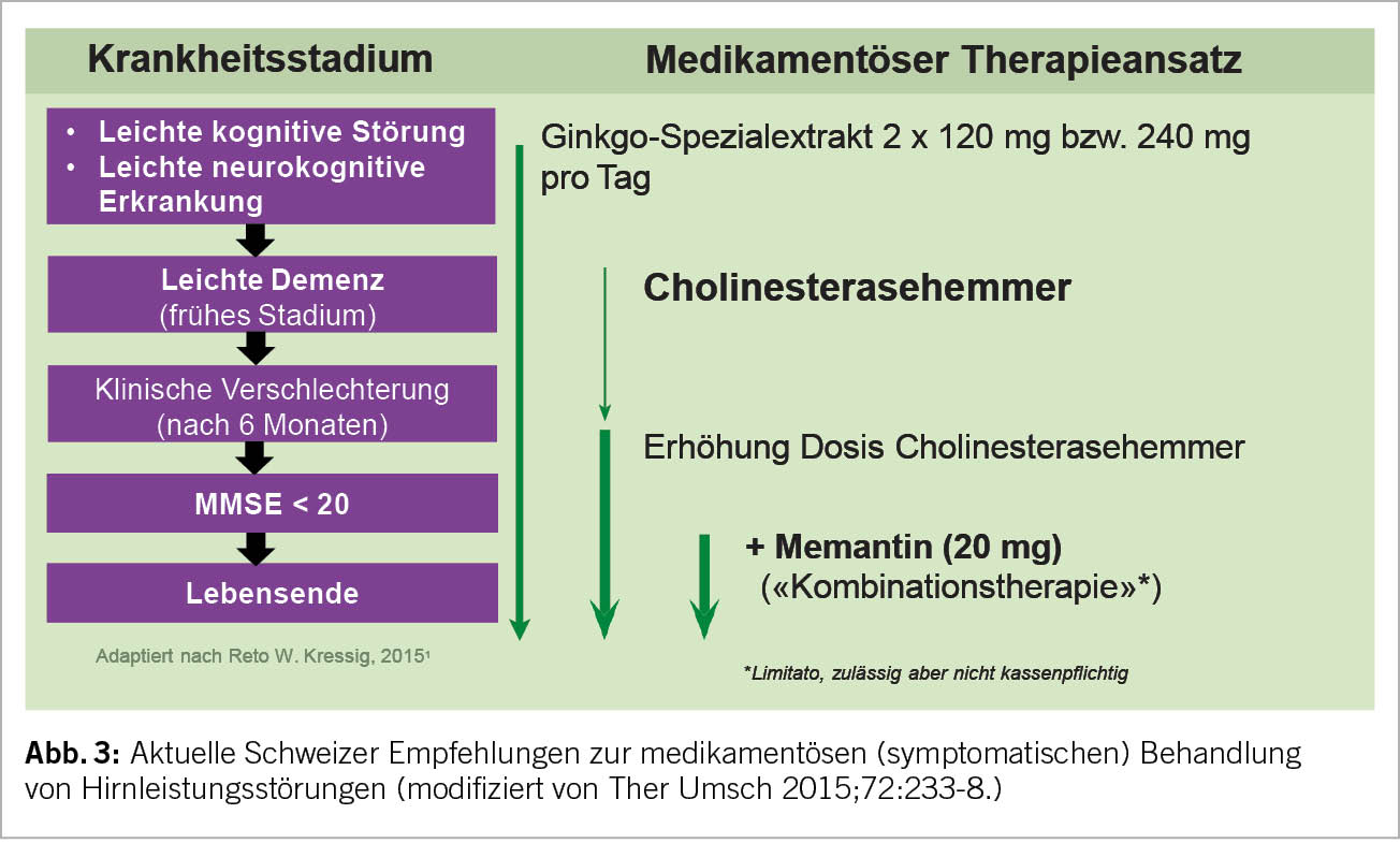 Bevor neue Medikamente zum Einsatz kommen, gilt es grundsätzlich, eine bereits vorhandene allfällige Polypharmazie auf kognitiv beeinträchtigende anticholinerge Substanzen zu überprüfen. Handelt es sich gemäss DSM-5 um «major» kognitive Störungen (Demenz) ist für die Festlegung der medikamentösen Therapie (meist mittels Bildgebung und/oder Biomarker) die dem Prozess zugrundeliegende Neuropathologie entscheidend. Handelt es sich um einen neurodegenerativen Prozess (Alzheimer Erkrankung), sind Stadium-abhängig Ginkgo, Cholinesterasehemmer und Memantine Mittel der ersten Wahl (Abb. 3). Bei dieser symptomatischen Therapie wird (bei frühzeitigem Beginn) der Verlauf der Krankheit bzgl. Funktionalitäts- und Selbständigkeitserhalt massgeblich verbessert. Diese Medikamente wirken ausgesprochen langsam, sind aber dank einer «Number Needed to Treat» (NNT) von unter 10 (für alle drei Substanzklassen!) mit einer hohen Responder-Rate versehen. Im Vergleich zu nicht-behandelten Kontrollpopulationen treten erste klinische Differenzen jedoch erst nach einem Jahr Behandlung auf; diese werden in den weiteren Jahren aber sehr relevant, da die Behandlung zu eindrücklich weniger Pflegeheimeintritten führt (7). Hier hat sich v.a. auch die Kombinationstherapie von Memantine mit Cholinesterasehemmer (bei MMSE < 20) als sehr erfolgreich erwiesen. Diese ist in der Schweiz jedoch nur off-label-mässig möglich und wegen einer Limitatio nicht voll von der Grundversicherung übernommen. Trotzdem: viele Patienten tragen (angesichts stark gefallener Antidementiva-Preise) die paar Hundert Franken pro Jahr gerne selber, wenn damit finanziell viel höhere Kosten einer Institutionalisierung gespart oder herausgeschoben werden können. Neben der durch Antidementiva länger erhaltenen Alltagsfunktionalität treten unter dieser Therapie auch signifikant weniger demenz-assoziierte Verhaltensauffälligkeiten auf (Aggression, Schreien, motorische Unruhe etc.).
