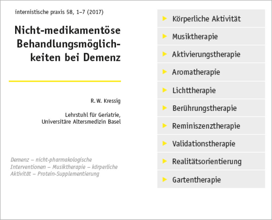 11. Kressig R W. Nicht-medikamentöse Behandlungsmöglichkeiten bei Demenz. internistische praxis. 2017;58(1):116–122.