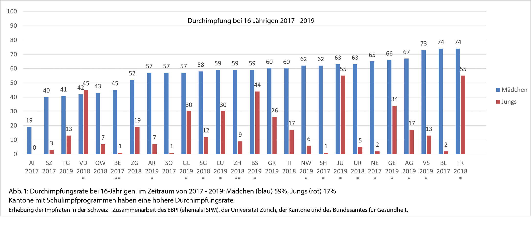 Seit Einführung der ersten HPV-Impfung mit Gardasil® hat sich einiges getan. Die Durchimpfungsrate bei den Mädchen steigt zwar langsam, aber stetig an und lag in der Zeitperiode 2017-2019 bei den 16-Jährigen durchschnittlich bei 59% (19-74 %). Seit 2015 besteht die Impfempfehlung auch für die Jungs und jungen Männer. Bei ihnen lag die durchschnittliche Rate der geimpften 16-Jährigen bei 17 % (0-55 %) in der gleichen Zeitperiode. Das vom Bundesamt für Gesundheit angesetzte Ziel von 80 % ist jedoch sicher noch nicht erreicht (Abb. 1).