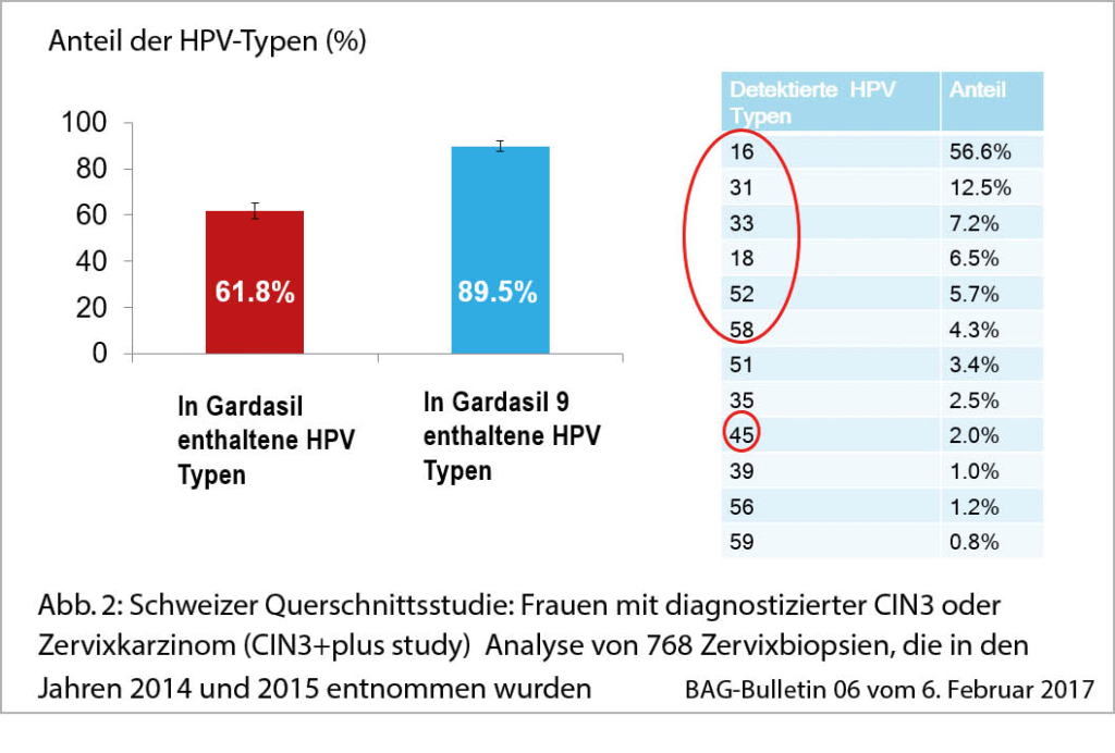 Eine vom Institut für Sozial- und Präventivmedizin der Universität Bern und dem BAG durchgeführte Studie konnte zeigen, dass die in Gardasil 9 enthaltenen Viren (16, 18, 31, 33, 45, 52 und 58) auch in der Schweiz am häufigsten vorkommen (Abb. 2).