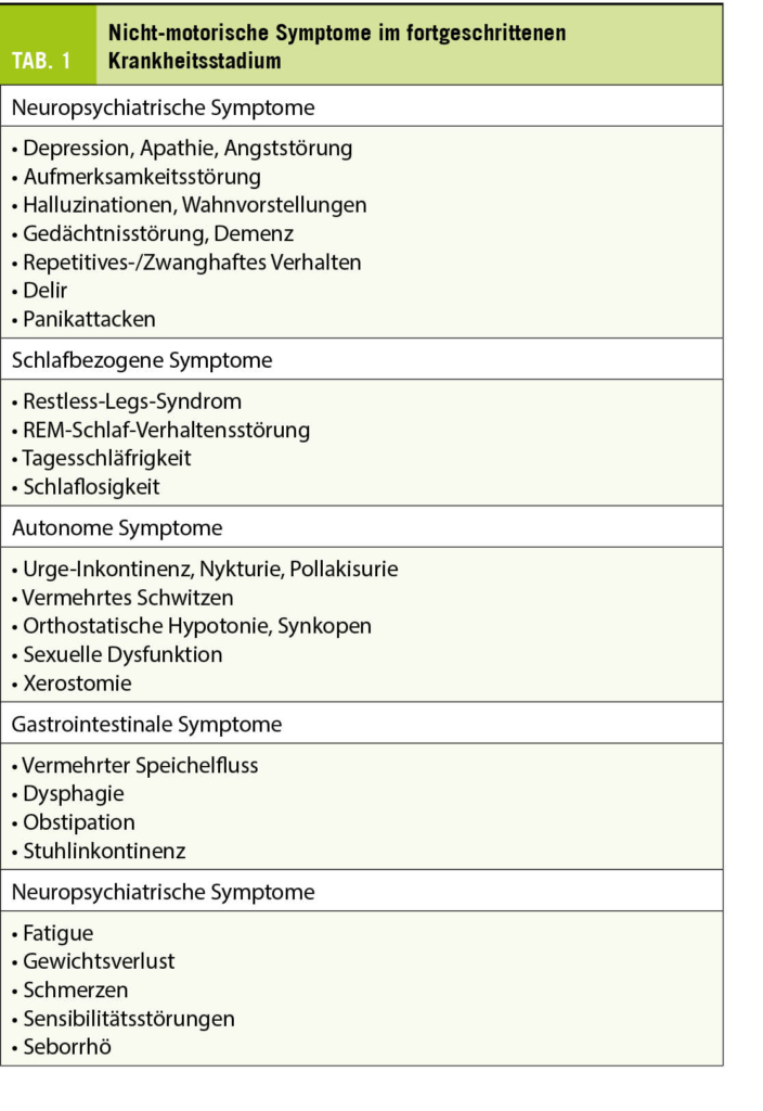 Neben motorischen Symptomen können auch zahlreiche nicht-motorische Symptome auftreten, welche für die Patienten meist sehr störend und somit wesentliche Determinanten der Lebensqualität sind (Tab. 1). Nach mehrjähriger Behandlung kommt es bei nahezu allen Patienten zu motorischen und teilweise auch nicht-motorischen Wirkfluktuationen (z.B. Verschlechterung der Stimmung oder der Kognition im Off Zustand) und Dyskinesien.