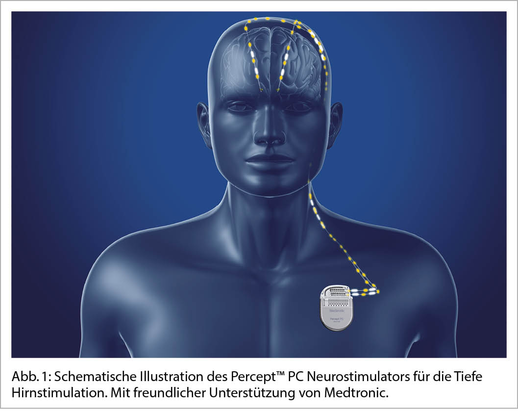 Zur Optimierung der Stimulationsparameter haben sich in den letzten Jahren neue vielversprechende Entwicklungen ergeben. Durch den Einsatz direktionaler Elektroden besteht mittels «Steering» die Möglichkeit, die Stimulation räumlich exzentrisch auszurichten, um somit das therapeutische Fenster unter Reduktion stimulationsbedingter Nebenwirkungen zu vergrössern (12). In der Vergangenheit bedurfte es oft wiederholter Sitzungen zur Programmierung der THS zur Optimierung der Stimulationsparameter. Mittlerweile stehen bildgebende und elektrophysiologische Ansätze zur Verfügung, die eine raschere Bestimmung der optimalen Stimulationskonfiguration erlauben und den Aufwand zur Austestung der Stimulation reduzieren (13). Eine sogenannte «adaptive» oder «closed-loop»-Technik, d.h. die Registrierung eines krankheitsspezifischen elektrophysiologischen Biomarkers (Betawellen-Aktivität) mit daran gekoppelter bedarfsadaptierter Stimulation, stellt seit Längerem eine Zukunftsperspektive zur Verbesserung der Effizienz der THS dar. Erste THS-Systeme verfügen bereits über eine Sensing-Technologie, die es erlaubt Betaaktivität aufzuzeichnen. Deren Technologie könnte in Zukunft im Rahmen von adaptiven oder «closed-loop» THS-Systemen zum Einsatz kommen (14).