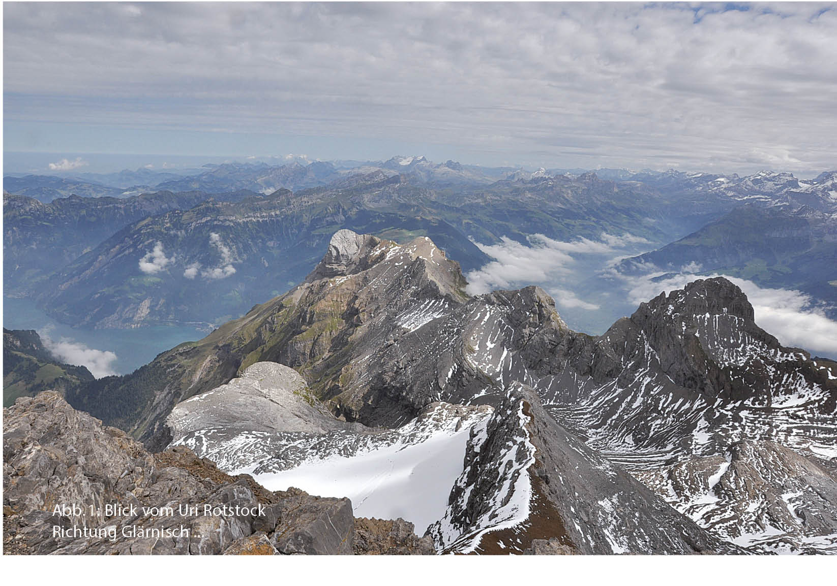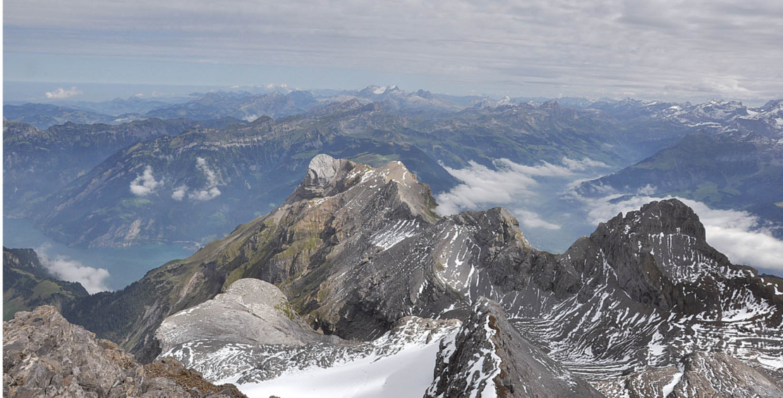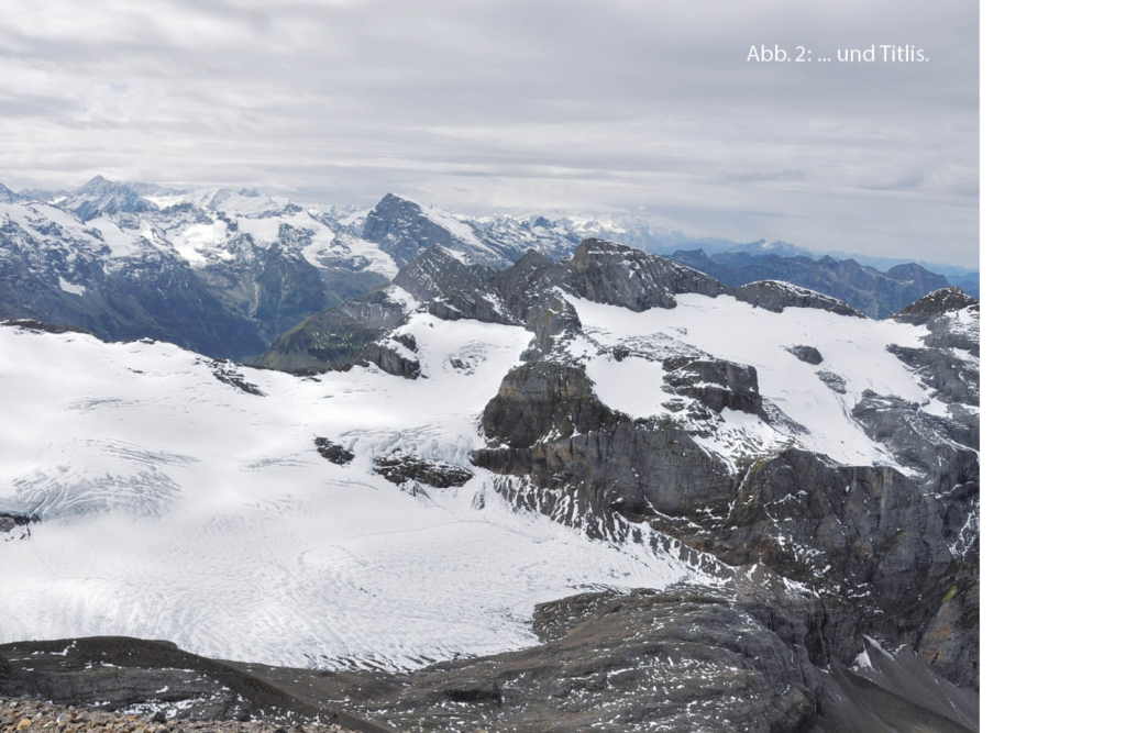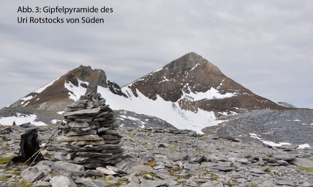 Der weiss-blau-weiss markierte Schlussaufstieg zum Gipfel des Uri Rotstocks gestaltet sich aufgrund der Vielfalt der hier aufgeschlossenen Gesteine sowie der sich laufend verändernden Aussicht äusserst kurzweilig. Auffallend sind die unterschiedlichen Farben der Gesteinsschichten, die zwischen grau und dunkelbraun variieren. Harte, Felswände bildende Kalksteinschichten wechseln mit dunklen Schiefer- und Kalksandsteinen ab, die der Verwitterung weniger Widerstand bieten und fast den gesamten Gipfelaufbau des Uri Rotstocks bilden. Von der Hütte steigen wir vorerst zur nördlichen Moräne des Blüemlisalpfirns auf, deren Kamm wir in südöstlicher Richtung folgen. Nach kurzer Zeit zweigt der Weg zum Einstieg des direkten, teilweise mit Ketten gesicherten Gipfelanstiegs ab. Diese Route mit kleineren Kletterpassagen ist trittsicheren, erfahrenen Berggängern vorbehalten. Wer sich im steilen, felsigen Gelände nicht sicher fühlt, benutzt weiter die Wegspur auf der Moräne bis auf den Südostgrat des Uri Rotstocks, der an einem Felskopf und einem Einschnitt vorbei unschwer zum Gipfel führt. Hier bleibt man nicht nur wegen des steilen Schlussanstiegs, sondern auch wegen der seltenen Weit- und Tiefsicht atemlos stehen, umgeben von zahllosen Gipfeln, zu Füssen der glitzernde Urnersee (Abb. 1 bis 3).