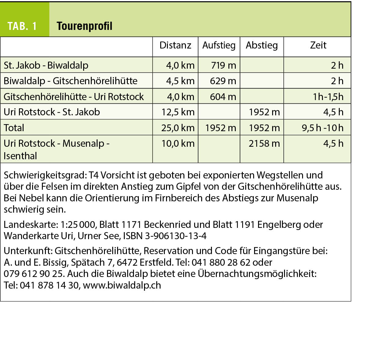 St. Jakob im Isenthal, das mit Privatfahrzeug oder Postauto ab Altdorf erreicht werden kann. Hier scheinen die umliegenden Berggipfel unendlich fern, kein Sonnenstrahl wärmt am frühen Morgen die Talsohle. Ein Gefühl wie im Himalaya. Entsprechend schwer fallen die ersten Schritte. Wir folgen vorerst dem Talsträsschen rund 500 Meter bergwärts bis Rüti (Punkt 1060), wo ein breiter Feldweg ostwärts abzweigt. Dieser führt in den Rütiwald und dann weiter in südlicher Richtung ins Witental, eine vom Fulen herunterziehende Runse. Hier gibt es die Möglichkeit, den Aufstieg zur Biwaldalp über einen praktisch in der Falllinie aufsteigenden Bergweg abzukürzen, anstatt den weiten Kehren des Alpweges zu folgen. Auf der Biwaldalp atmet es sich bereits freier, der Blick auf Chaiserstuel, Gross Rimistock und Engelberger Rotstock öffnet sich. Auch bietet sich die Möglichkeit zu einer Stärkung mit lokalen Spezialitäten. Wer in der Gitschenhörelihütte übernachten möchte, bezieht hier den Schlüssel. Eine vorausgehende Reservation der Hütte ist empfehlenswert.