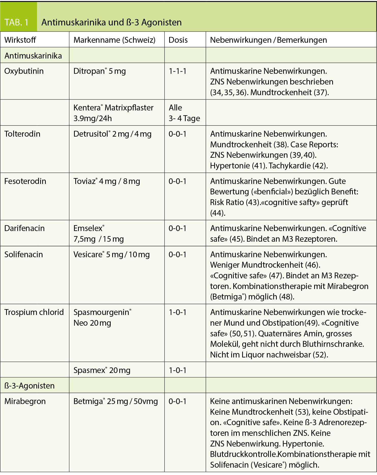 Antimuskarinika hemmen kompetitiv die Muskarinrezeptoren am Detrusor und blockieren den Parasympathikus, welcher die Blasenentleerung verantwortet. Sie haben einen moderaten Effekt (33) und können die Anzahl der Inkontinenzepisoden und die Miktionsfrequenz reduzieren. Antimuskarinika sind in Studien meist mit Hilfe von Miktionstagebüchern gegenüber Placebo oder einem älteren Antimuskarinikum getestet. In der Effektivität unterscheiden sie sich kaum voneinander, hingegen im Nebenwirkungsprofil: Beim älteren Präparat Oxybutynin (Ditropan®, Kentera® Matrixpflaster) sind ZNS Nebenwirkungen beschrieben. Tolterodin (Detrusitol®) und Fesoterodin (Toviaz®) sollen sich verstärkt an der Blase konzentrieren, Fesoterodin wird ein gutes Nutzen-Risiko-Verhältnis attestiert. Solifenacin (Vesicare®) und Darifenacin (Emselex®) sind M3 selektiv und binden hauptsächlich an den Subtyp III der Muscarinrezeptoren und weniger an den Subtyp II, welcher im ZNS vorkommt und gelten bezüglich ZNS Nebenwirkungen als sicher. Das quaternäre Amin Trospium chlorid (Spasmo-Urgenin® Neo, Spasmex®) ist ein grosses Molekül und kann die Bluthirnschranke nicht passieren, also «cognitive safe» (siehe Tabelle).