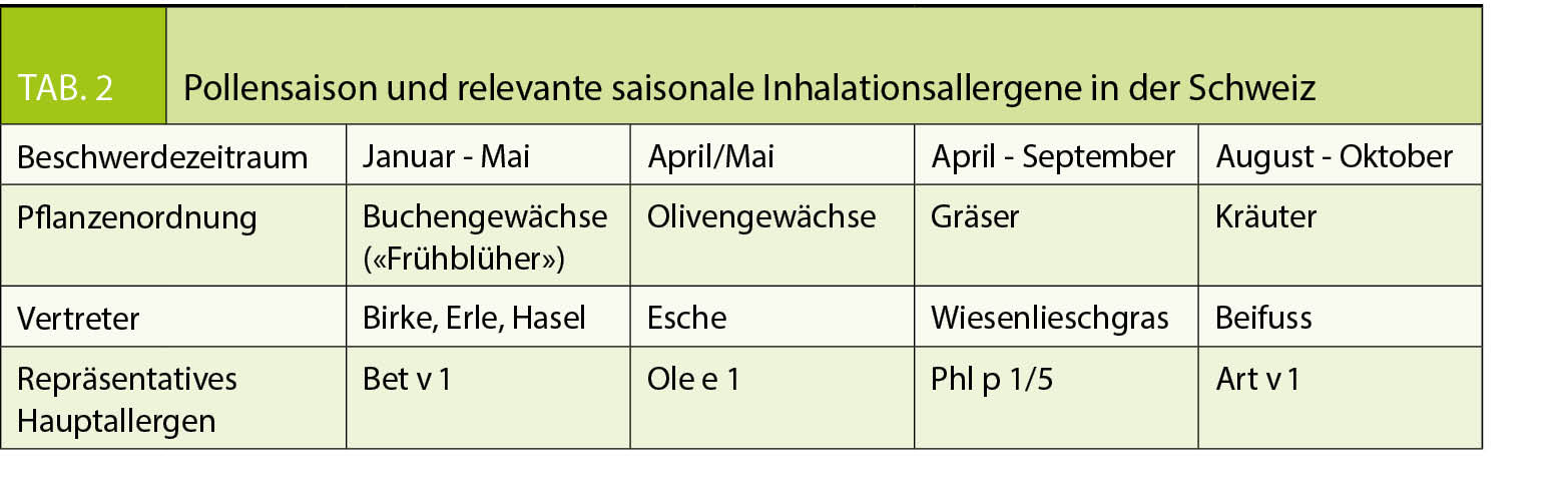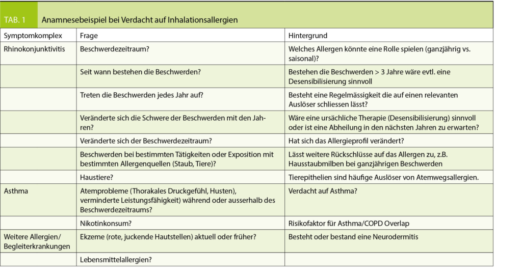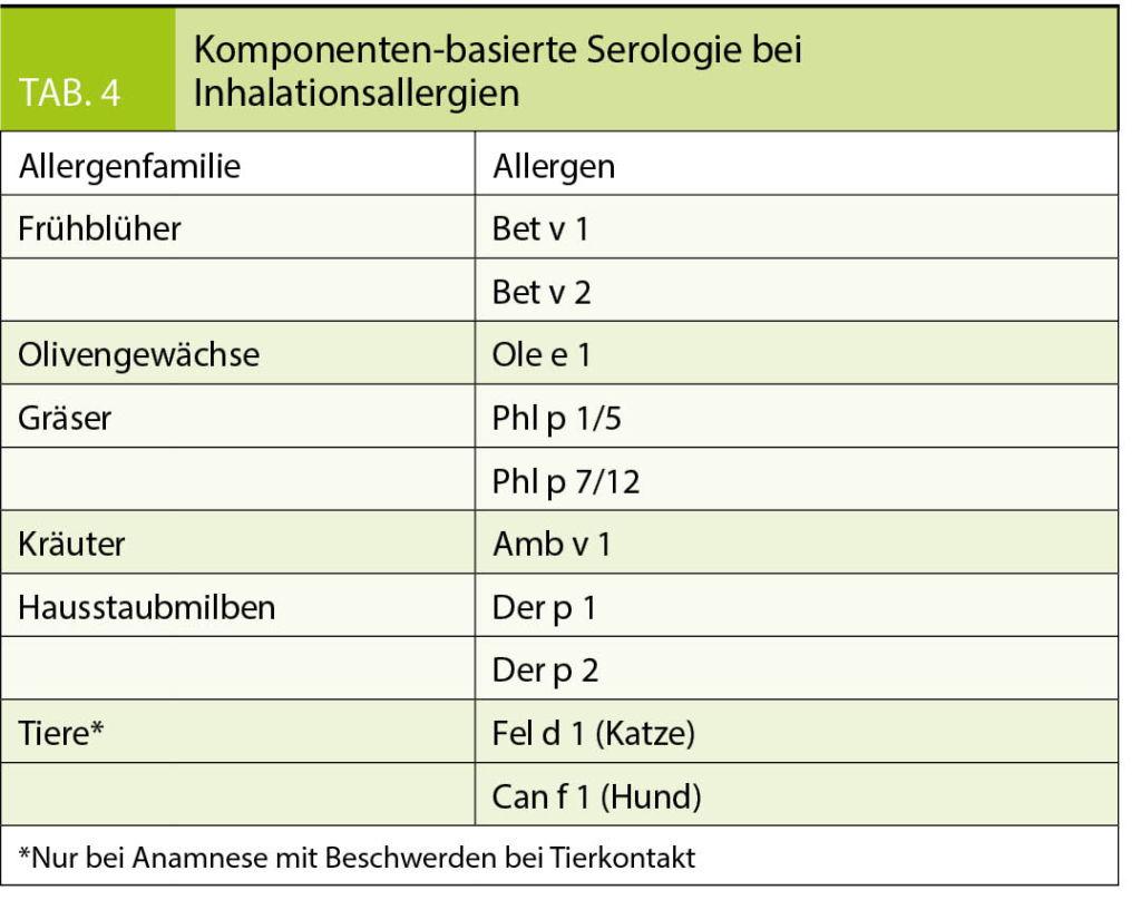 Die Anamnese ist der wichtigste Schritt der allergologischen Diagnostik. Wie eine sinnvolle Anamnese aussehen könnte zeigt Tab. 1. Die Anamnese ist unerlässlich, um zu beurteilen, ob eine Allergie überhaupt wahrscheinlich ist und damit weitere Tests nötig sind. Nach den Tests muss evaluiert werden, ob die Symptome überhaupt zu den Ergebnissen aus Pricktests und Serologie passen. So macht es bei Verdacht auf eine saisonale Inhalationsallergie gegen Pollen Sinn, den Beschwerdezeitraum mit der Blütezeit der einzelnen Pflanzenfamilien, sowie den Ergebnissen einer Komponenten-basierten Serologie (siehe unten) zu korrelieren (Tab. 2). Zudem sollen weitere Erkrankungen aus dem Formenkreis der Atopie erfasst werden.