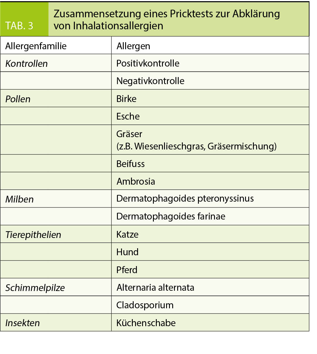 Im nächsten Schritt der allergologischen Abklärung erfolgt der Pricktest. Er ist einfach, liefert Resultate nach 20 Minuten und gibt einen kostengünstigen Überblick über die Sensibilisierung auf eine Vielzahl von Allergenen. Daher ist er auch für die Hausarztpraxis sinnvoll. Die Europäische Akademie für Allergologie und klinische Immunologie hat eine Empfehlung abgegeben, welche wichtigen saisonalen und ganzjährigen (perennialen) Allergene im Pricktest enthalten sein sollten (Tab. 3) (5). Leider sind nicht immer alle empfohlenen Pricktest Lösungen lieferbar.