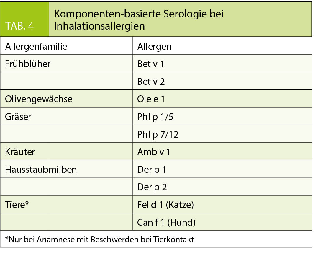 Das Konzept der Haupt- und Nebenallergen soll kurz erläutert werden. Pollen beinhalten verschiedene Allergene. Zum Beispiel wurden aus Birkenpollen bisher acht Allergene charakterisiert, die als Bet v 1 bis Bet v 8 bezeichnet werden. Ein Hauptallergen ist definiert als ein klinisch relevantes Allergen, das in grossen Mengen in der Allergenquelle vorhanden ist, und wogegen mindestens 50% der allergischen Individuen sensibilisiert sind. So ist Bet v 1 das Hauptallergen der Birkenpollen, gegen das >95% der Birkenpollenallergiker sensibilisiert sind (7, 8). Bet v 2 bis 8 sind die Nebenallergene der Birke, und kommen in geringerer Konzentration in Birkenpollen vor. Hauptallergene sind ausserdem charakteristisch für eine Allergenfamilie (Tab. 4). So ist Bet v 1 charakteristisch für alle Frühblüher, da ein dem Bet v 1 sehr ähnliches (homologes) Allergen auch in anderen Frühblühern wie Hasel und Erle das Hauptallergen ist. Eine Sensibilisierung gegen Bet v 1 zeigt nicht nur eine Birkenpollenallergie, sondern eine Allergie gegen alle frühblühenden Bäume an. Im Gegensatz dazu sind Nebenallergene oft Panallergene, die in ganz verschiedenen Allergenquellen vorkommen. Zum Beispiel kommt Bet v 2 nicht nur in Birken und anderen Frühblühern vor, sondern in homologer Form auch in Gräsern und Kräutern (9). Ein gegen Bet v 2 sensibilisierter Patient wird also einen positiven Pricktest nicht nur mit Birken und Frühblüher, sondern auch mit Gräsern und Kräutern haben. Diese Patienten sind damit im Pricktest «gegen alles positiv». In diesem Fall braucht es die Serologie mit Komponenten-basierter Diagnostik, um das relevante Allergen zu bestimmen.