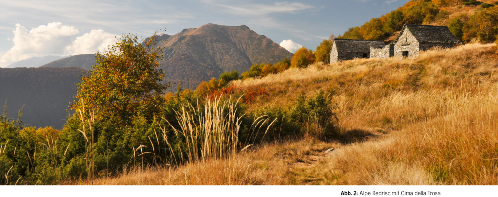 Die Häusergruppen von Porchesio liegen verstreut auf einer breiten Hangschulter. Die Aussicht hinüber zur Pyramide des Pizzo di Vogorno und über die Piano di Magadino hinaus zum Ceneri und Monte Tamaro ist herrlich. Schon hier wähnt man sich wie in einem Flugzeug. Doch es soll noch besser kommen. Bei den zentralen Häusern von Mòtt beginnt ein weiss-blau-weiss markierter Pfad, der zum Ostgrat des Madone hinaufleitet. Dieser bildete früher den Zugang zur Alpe Redrisc, die wir leicht und schon nach kurzer Zeit erreichen. Im Herbst scheinen die zwei Alphütten in einem goldenen Grasmeer zu schwimmen (Abb. 2). Der Tiefblick in die Valle di Corippo mit seinen vielen Maiensiedlungen und weiter in das Haupttal hinein ist atemberaubend.
