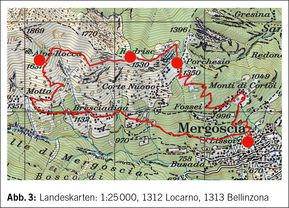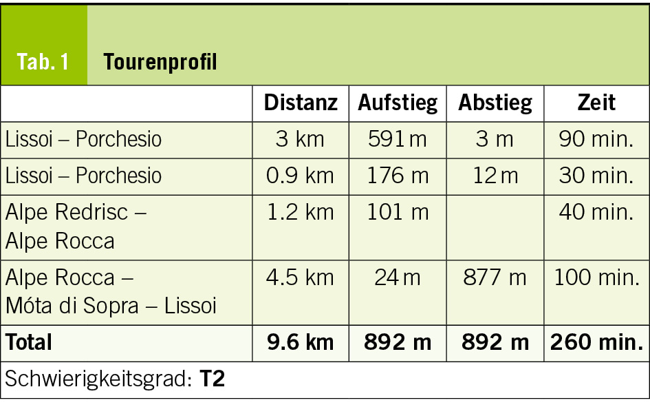 Über einen Zickzackpfad steigen wir steil nach Móta di Sopra ab. Der Weg umgeht dieses Maiensäss gegen Süden und führt zum Hauptweg des Tales hinab. Bergwärts liegen nur noch die Maiensiedlung Fàed und die Alpe di Bietri, auf der noch heute ein köstlicher Alpkäse hergestellt wird. Über Bresciàdiga, Campitt, Sestrill und Campegliài gelangen wir nach Ranzòi, wo wir in einer spitzen Kehre den markierten Weg gegen Südosten verlassen und uns einem ebenfalls breiten, aber kaum mehr begangenen Pfad anvertrauen, der uns sanft abfallend nach Lissoi zurückbringt. Hier stossen wir wieder auf den zu Beginn eingeschlagenen Bergweg, über den wir die engstehenden Häuser des Dorfteils und den Ausgangspunkt unserer Wanderung erreichen (Abb. 3).