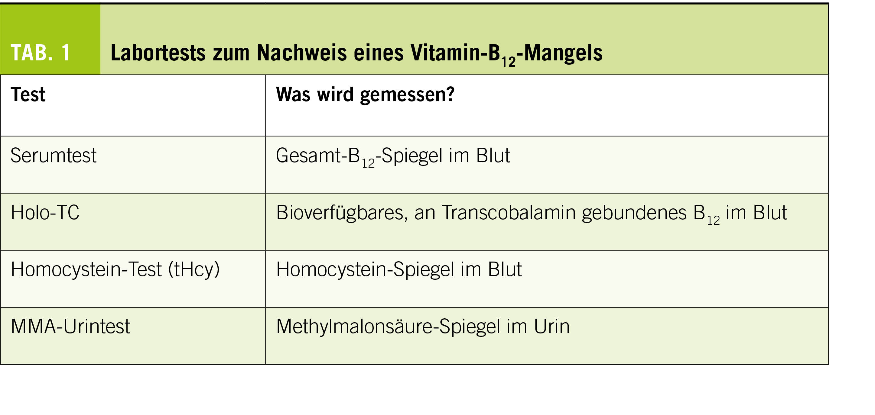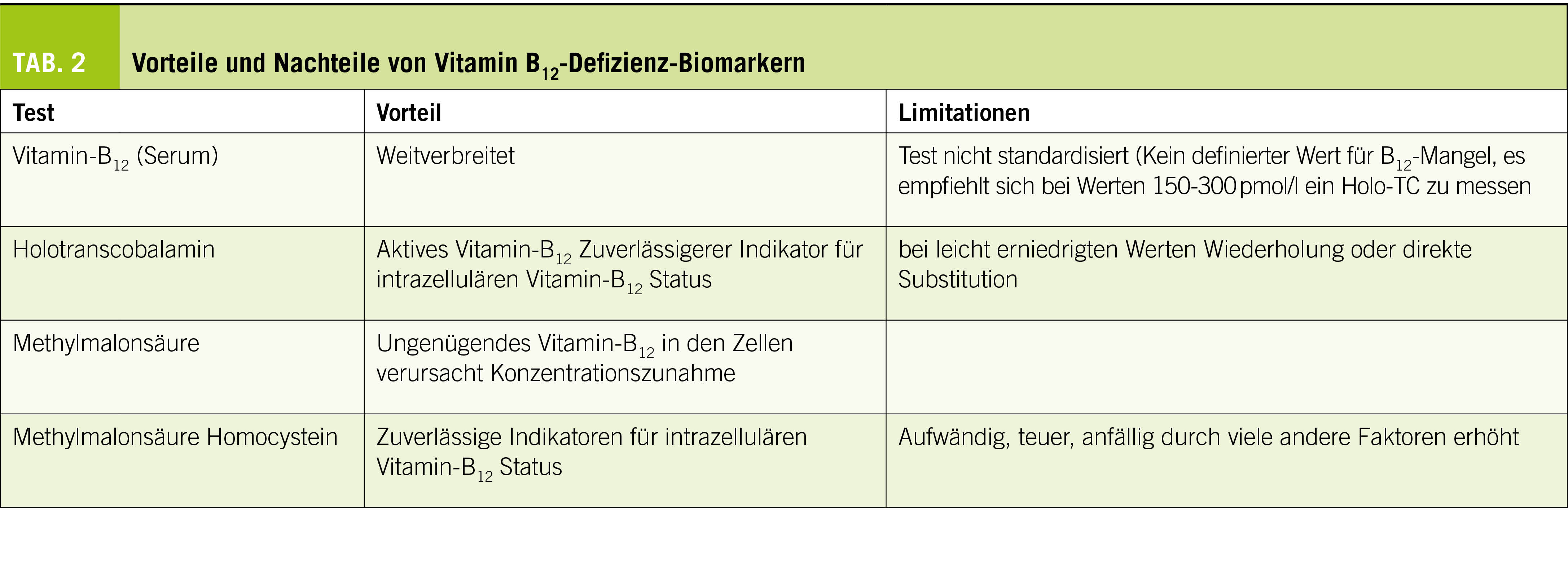 Kein einzelner Biomarker ist für die Beurteilung des B12-Status bei allen Patienten geeignet. Die Anwendung mehrerer Marker, sei es durch einen sequentiellen Selektionsalgorithmus oder durch die Berechnung eines einzigen diagnostischen Indikators wie B12, führt zu einer Verringerung der Zahl der übersehenen B12-defizienten Patienten. Es gibt mehrere Serumbiomarker, die für die Diagnosestellung bei einem Patienten mit Vitamin-B12-Defizienz nützlich sein können. Zusätzlich zum Vitamin-B12-Test wird Holotranscobalamin, welches bei Vitamin-B12-Defizienz erniedrigt ist, als Marker einer B12-Defizienz angesehen (2). Erhöhte Werte von Homocys-tein (tHcy) und Methylmalonsäure (MMA) haben sich als Marker von ungenügenden intrazellulären B12-Werten erwiesen (2). Die (Tab. 1) gibt eine Übersicht über die relevanten Tests