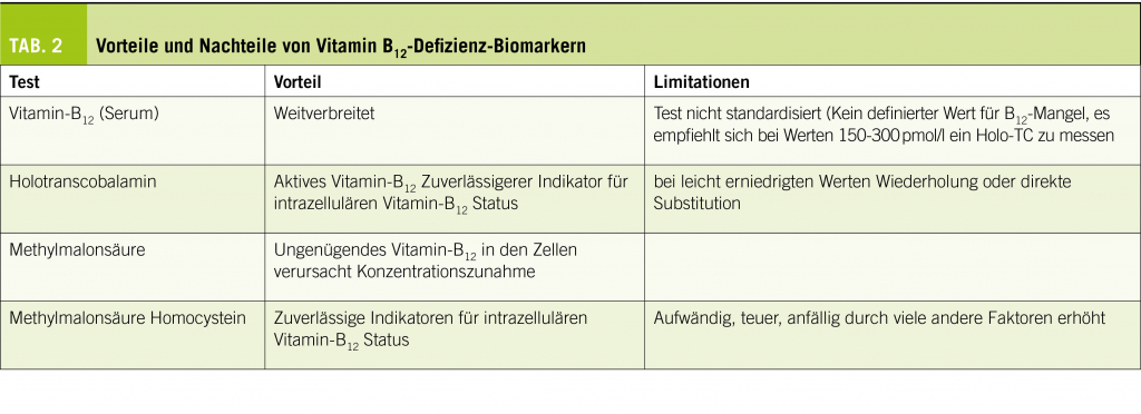 Es gibt mehrere Limitationen für Biomarker zur Erkennung von Vitamin-B12-Mangel. Der Serum-Vitamin-B12-Assay ist nicht standardisiert (3) und es gibt keinen vereinbarten Cut-off, um einen Mangel zu definieren. Die WHO schlug vor, 150 pmol/l zu verwenden, wobei der Gesamtvitamin-B12-Gehalt von 156-450 einen Vitamin-B12-Mangel nicht ausschliessen kann. Auf der anderen Seite sind Plasma MMA und tHcy nicht ohne weiteres verfügbar und auch die Wiederholungsintervalle sind nicht standardisiert. Da die einzige Fraktion von Vitamin-B12, die für die systemische Verteilung bioverfügbar ist, in Form von Holo-TC vorliegt, wurde der Gehalt an Holo-TC im Serum erfolgreich als Ersatz für das bioaktive Vitamin B12 verwendet (4). Holo-TC stellt etwa 20% des gesamten Vitamins B12 im Serum dar. Dieser Marker gilt als genauer in der Beurteilung der biologisch aktiven Fraktion von Vitamin B12 im Umlauf als Serum B12 selbst und korreliert mit der Konzentration von Serum B12 in Erythrozyten (5). Andererseits hat sich der Diagnosewert von Holo TC, dessen Normalbereich bei Gesunden 20-125 pmol/l beträgt, als gegenüber tHcy und MMA für die Einschätzung des Vitamin-B12-Status bei älteren Personen als überlegen erwiesen (5). Die Vor-und Nachteile der verschiedenen Vitamin-B12-Defizienz-Biomarker sind in der Tabelle 2 beschrieben.
