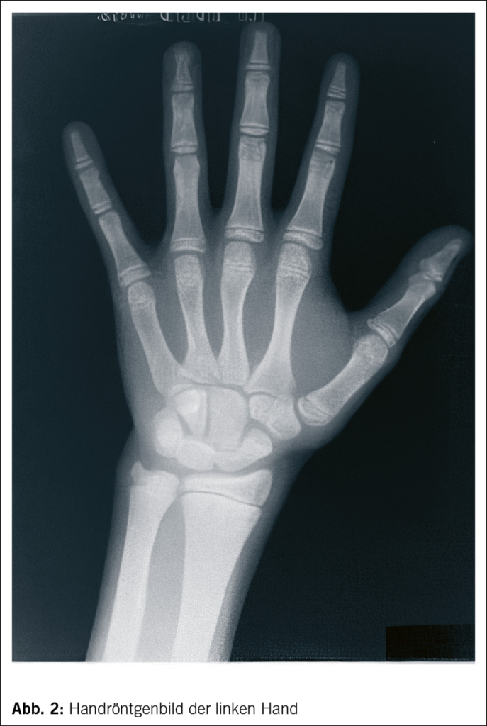 Zu jeder Wachstumsabklärung gehört ein Handröntgenbild der linken Hand, damit das Knochenalter bestimmt werden kann (Abb. 2). Die Knochenreifung (man spricht auch vom «Knochenalter») ist ein gutes Mass für das biologische Alter. Aufgrund des Handröntgenbildes können erfahrene Ärzte berechnen, wann ungefähr die Pubertätsentwicklung beginnen wird, das heisst, ob sie früh oder spät einsetzen wird. Daraus lässt sich ableiten, wie gross ein Kind letztlich als Erwachsener sein wird.