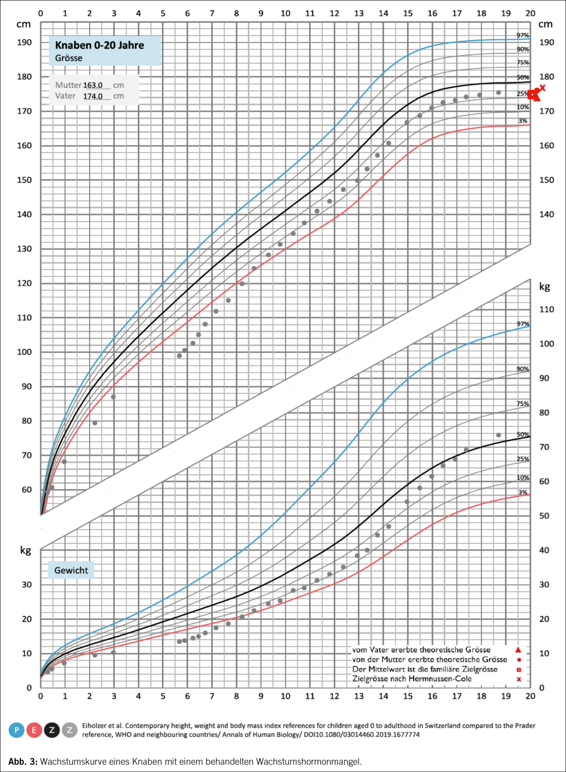 Bei Eltern mit sehr unterschiedlichen Körpergrössen kann diese Formel irreleiten, weil das Kind die Grösse nur eines Elternteils geerbt haben kann. Deshalb tragen wir auf der Wachstumskurve neben der familiären Zielgrösse auch die geschlechtskorrigierten Grössen der Eltern ein. Für einen Knaben die Grösse seines Vaters und die Grösse seiner Mutter plus 13 cm und für ein Mädchen die Grösse der Mutter und die Grösse des Vaters minus 13 cm. Cave: Die untere Grenze des Wachstums sollte nicht mehr als 3 cm unter der korrigierten Grösse des kleineren Elternteils liegen.
