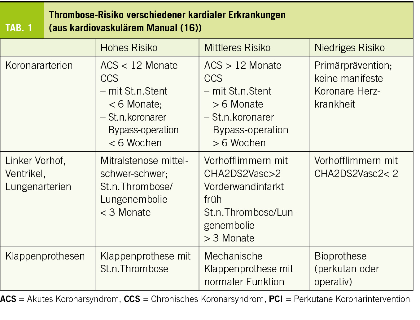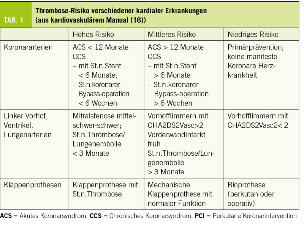 Arterielle und venöse thrombotische und thromboembolische Ereignisse sind für einen wesentlichen Teil der kardiovaskulären Erkrankungen verantwortlich, beispielsweise im Rahmen der koronaren Herzkrankheit, von Vorhofflimmern und –flattern oder von venösen Thrombosen und Lungenembolien. Die Thrombocytenaggregationshemmung sowie die Hemmung der plasmatischen Gerinnung beeinflussen entscheidend den Verlauf dieser kardiovaskulären Erkrankungen durch Reduktion von thrombotischen Ereignissen im arteriellen und venösen System. Generell aber ist eine effiziente Gerinnungshemmung immer auch mit einem erhöhten Blutungsrisiko verbunden. Der Erfolg einer antithrombotischen Behandlung misst sich am Netto-Benefit zwischen Verhinderung von thrombotischen Ereignissen und der Inkaufnahme von (mehr) Blutung. Für verschiedene Krankheitsentitäten lässt sich das Thromboserisiko in drei Risikogruppen einteilen (Tab. 1).