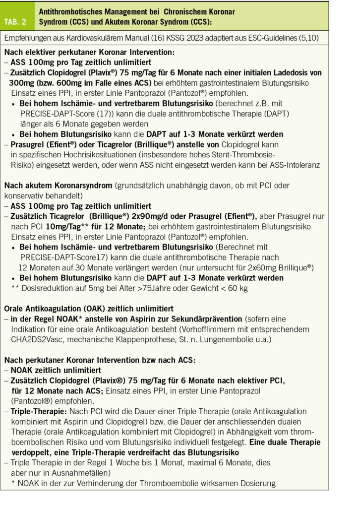 Antithrombotische Therapie nach elektiv durchgeführter Koronarintervention bei CCS sowie nach ACS: Die Definition der Dauer und die Wahl der antithrombotischen Therapie nach perkutaner Koronarintervention und Stentimplantation bleibt ebenfalls eine Herausforderung (8). Unter dem Gesichtspunkt des Ischämierisikos hängen Art und Dauer der dualen antithrombotischen Therapie von der klinischen Situation (ACS vs. CCS) und der Komplexität des Koronareingriffs ab. Eine Verlängerung der intensivierten antithrombotischen Therapie kann zwar das Ischämierisiko verringern, ist aber mit einer erhöhten Blutungsgefahr und damit potenziell einer erhöhten Sterblichkeit verbunden (8). Die Richtlinien empfehlen deshalb, die Dauer der dualen antithrombotischen Therapie zu individualisieren (9). Die Anpassung an die individuelle klinische Situation bleibt auch deshalb eine Herausforderung, weil erstens Blutungen und Ischämie gemeinsame Prädiktoren haben, und zweitens Thrombozytenfunktionstests nachweislich im klinischen Alltag nicht hilfeich für die Entscheidungsfindung sind. Tabelle 2 fasst die für den Alltag wichtigsten Empfehlungen zusammen.