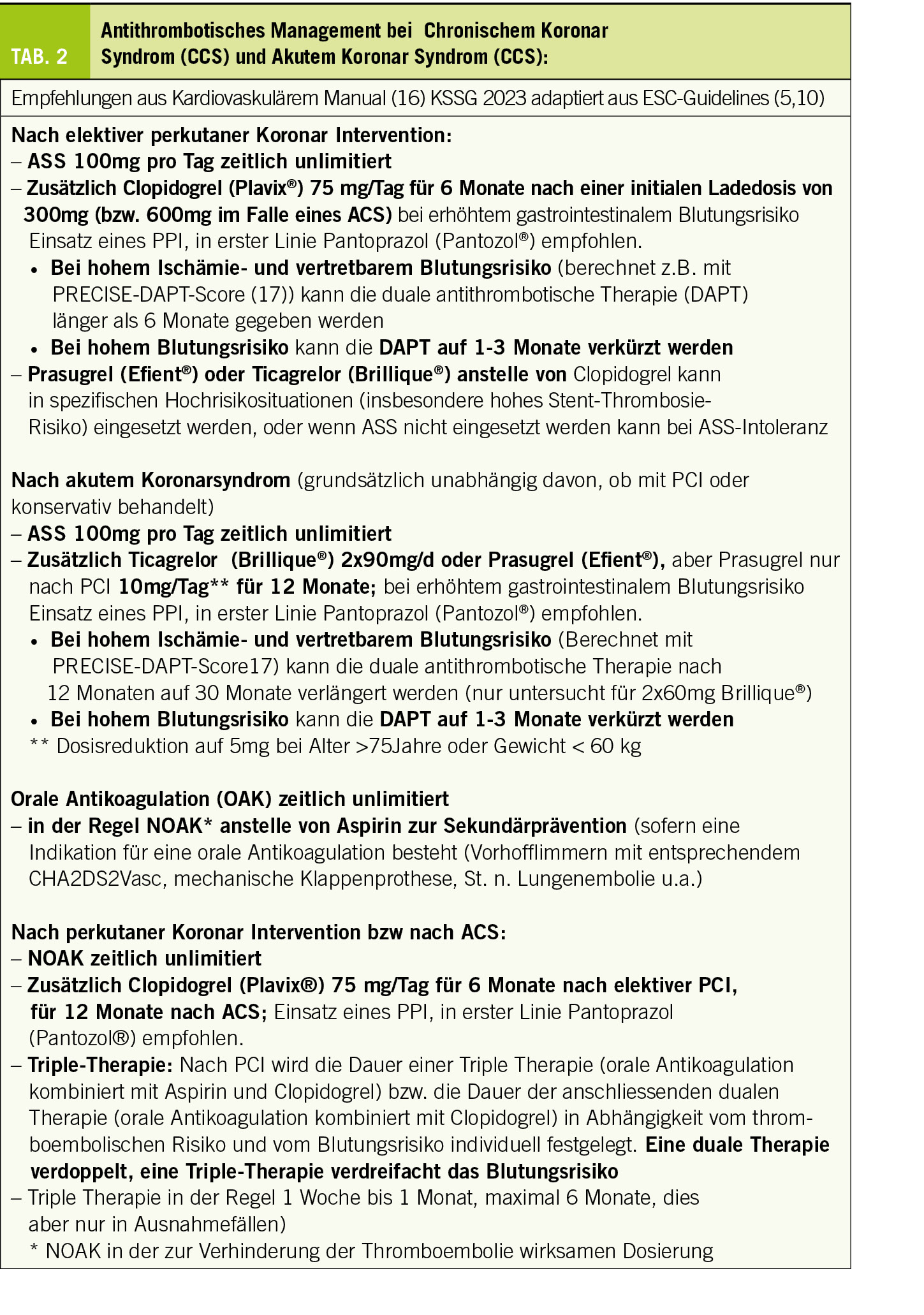 In erster Linie wird bei ASS-Intoleranz Clopidogrel in einer Dosierung von 75mg empfohlen. Bzgl. einer differenzierten Darstellung sei auf die ausführlichen europäischen Richtlinien verwiesen (5). Die über Jahrzehnte gültige Empfehlung, bei CCS bzw. 1 Jahr nach ACS in der Langzeitsekundärprävention eine Plättchenhemmermonotherapie bzw. bei Patienten mit Antikoagulationsindikation eine Antikoagulationsmonotherapie durchzuführen, wurde mit der Richtlinie von 2019 im Sinne einer Individualisierung leicht modifiziert (5). Insbesondere bei in der COMPASS-Studie untersuchten schwer polyvaskulär kranken CCS-Patienten mit begleitendem Diabetes, peripher arterieller Verschlusskrankheit und Sinusrhythmus kann unter Berücksichtigung des Blutungsrisikos zeitlich unlimitiert eine niedrig dosierte Antikoagulationstherapie mit 2×2.5 mg Rivaroxaban täglich zusätzlich zu ASS 100 mg in Betracht gezogen werden (7).