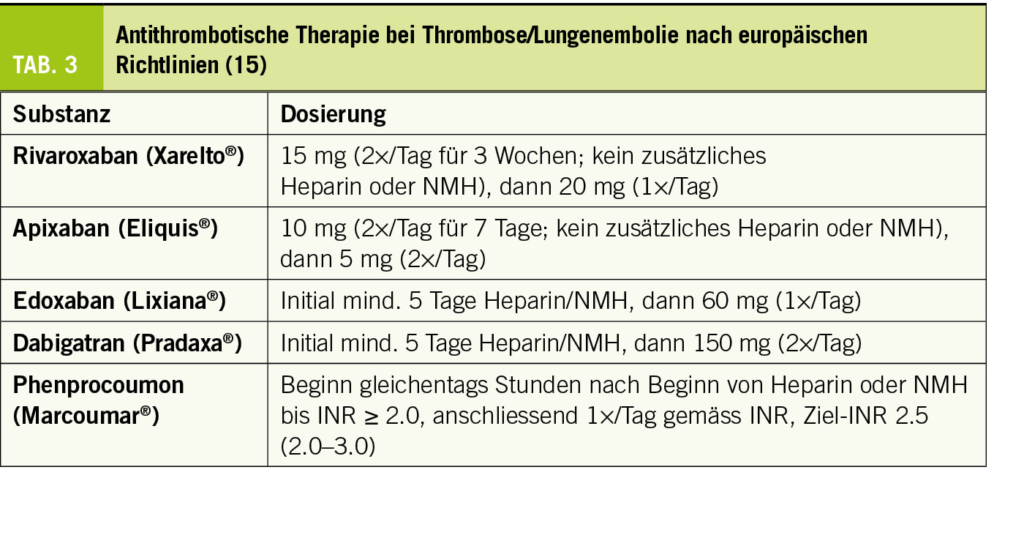 Bezüglich Diagnostik und Risikostratfizierung von Thrombose und Lungenembolie sei auf die neuesten europäischen Richtlinien verwiesen (15). Die NOAKS haben sich gegenüber der antithrombotischen Behandlung mit VKA weitgehend durchgesetzt. Wie in Tabelle 3 ersichtlich, ist die initiale Behandlung entsprechend den in diesem Setting durchgeführten randomisierten Studien bei den verschiedenen NOAKS unterschiedlich.