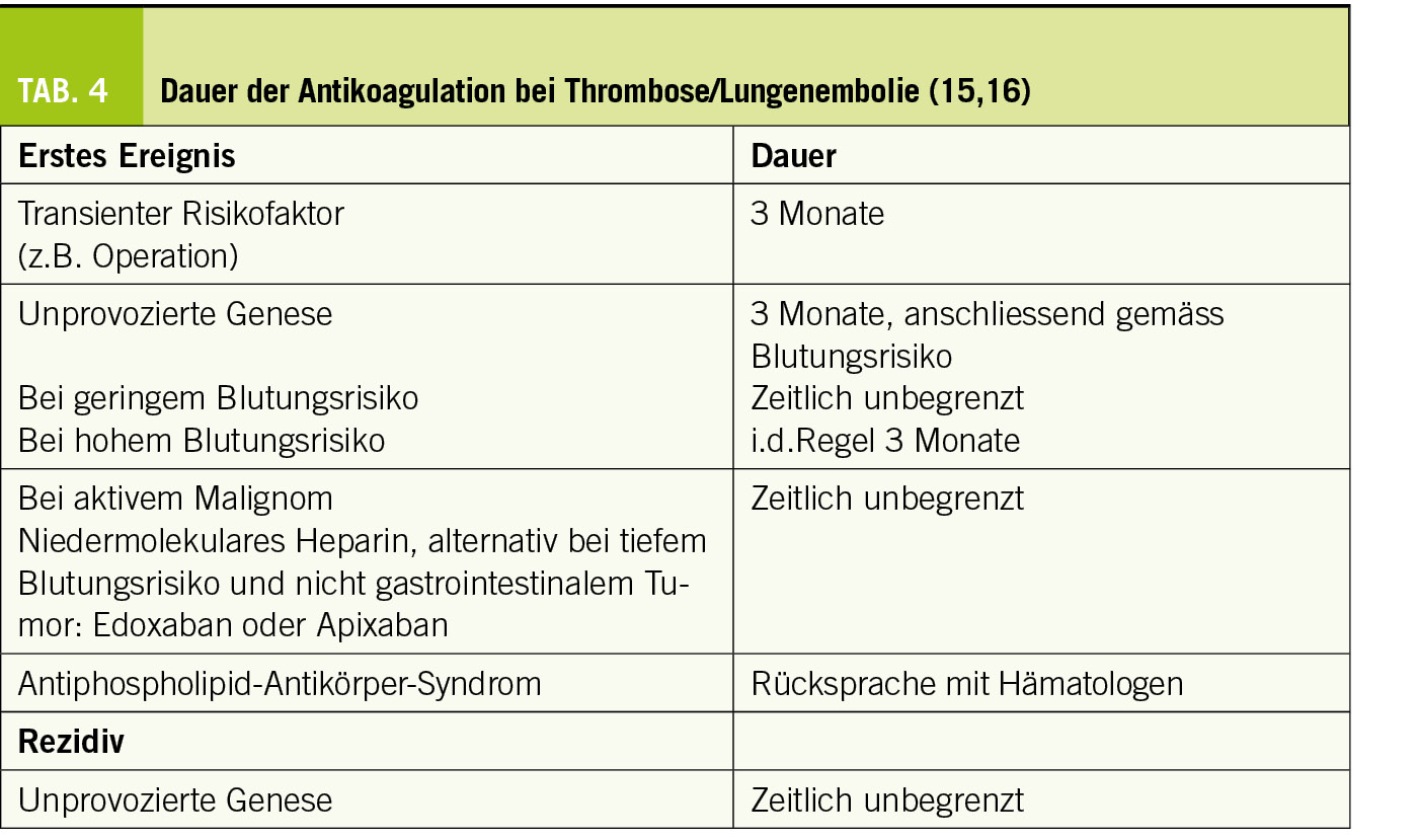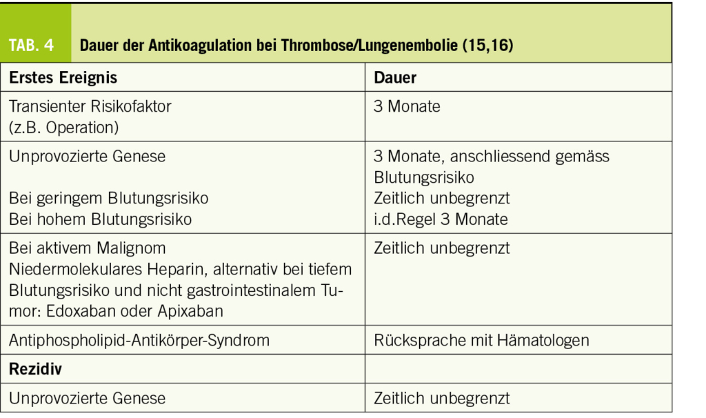 Neben der Behandlung des akuten thromboembolischen Ereignisses soll die OAK auch ein erneutes Ereignis verhindern. Grundsätzlich soll die OAK mindestens 3 Monate weitergeführt werden. Anschliessend wird ein individualisiertes Vorgehen empfohlen, je nach Risikosituation und Abschätzung des zukünftigen Thrombose- und Blutungsrisikos interdisziplinär mit Hämatologen (Tab. 4).